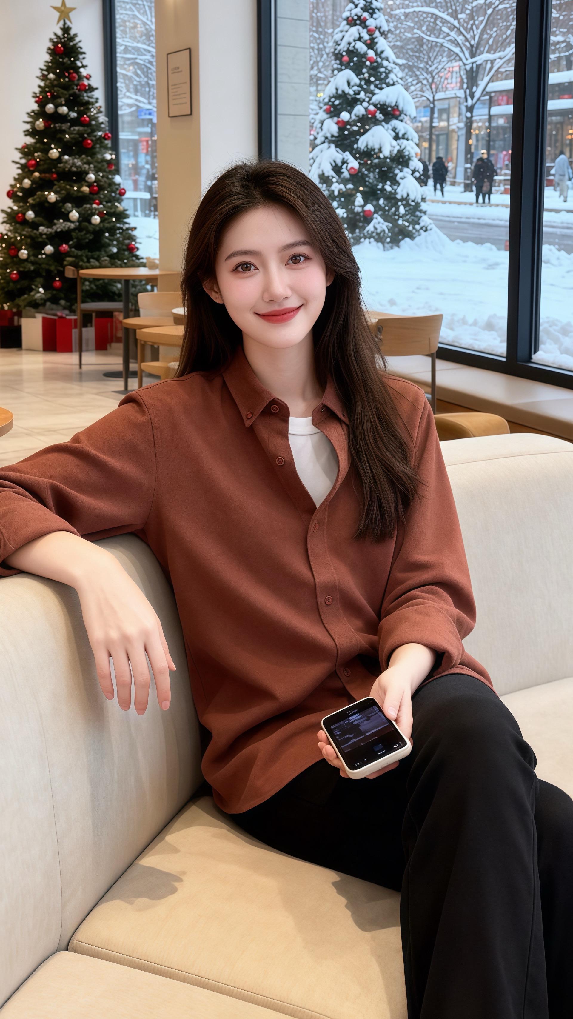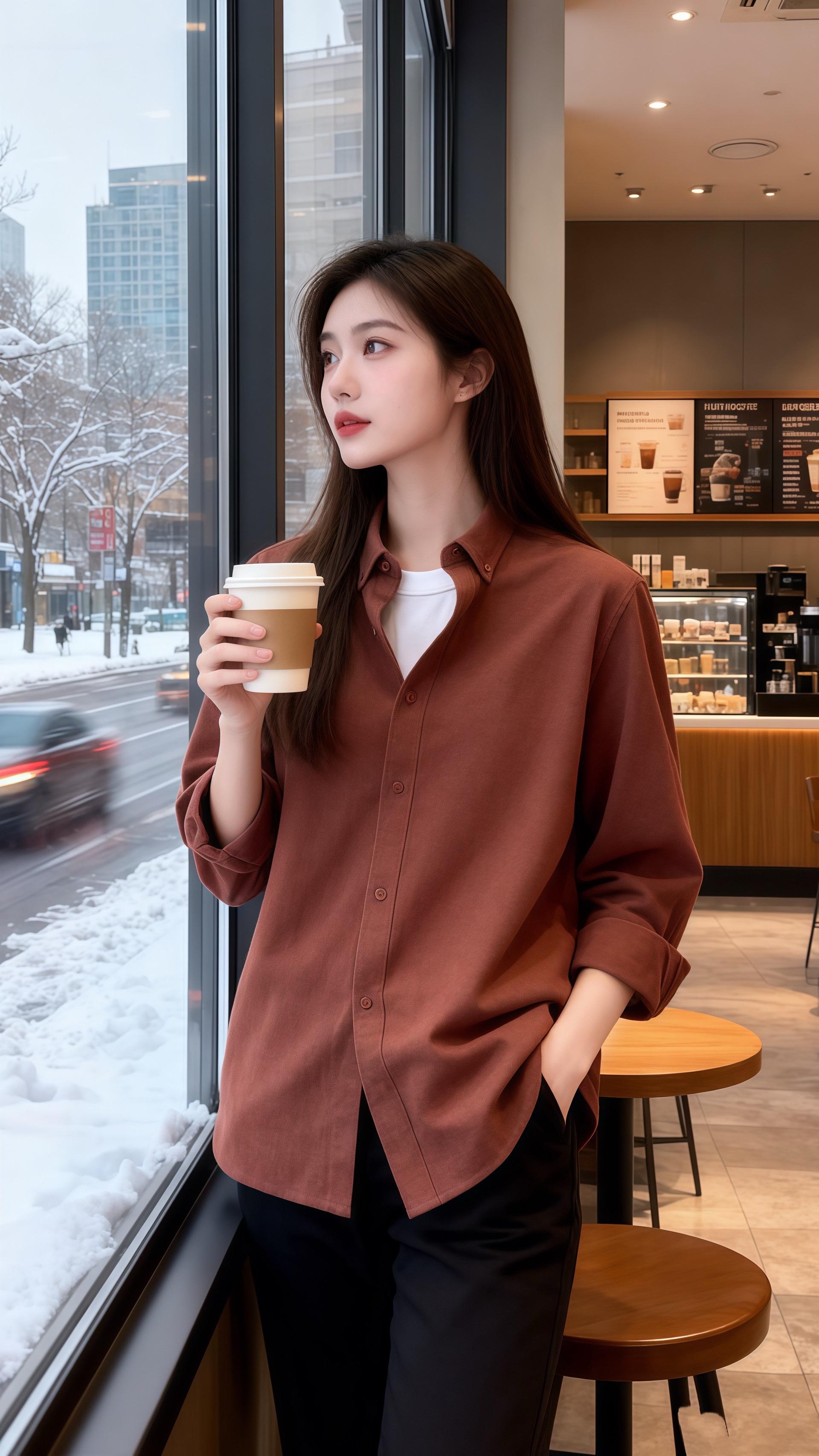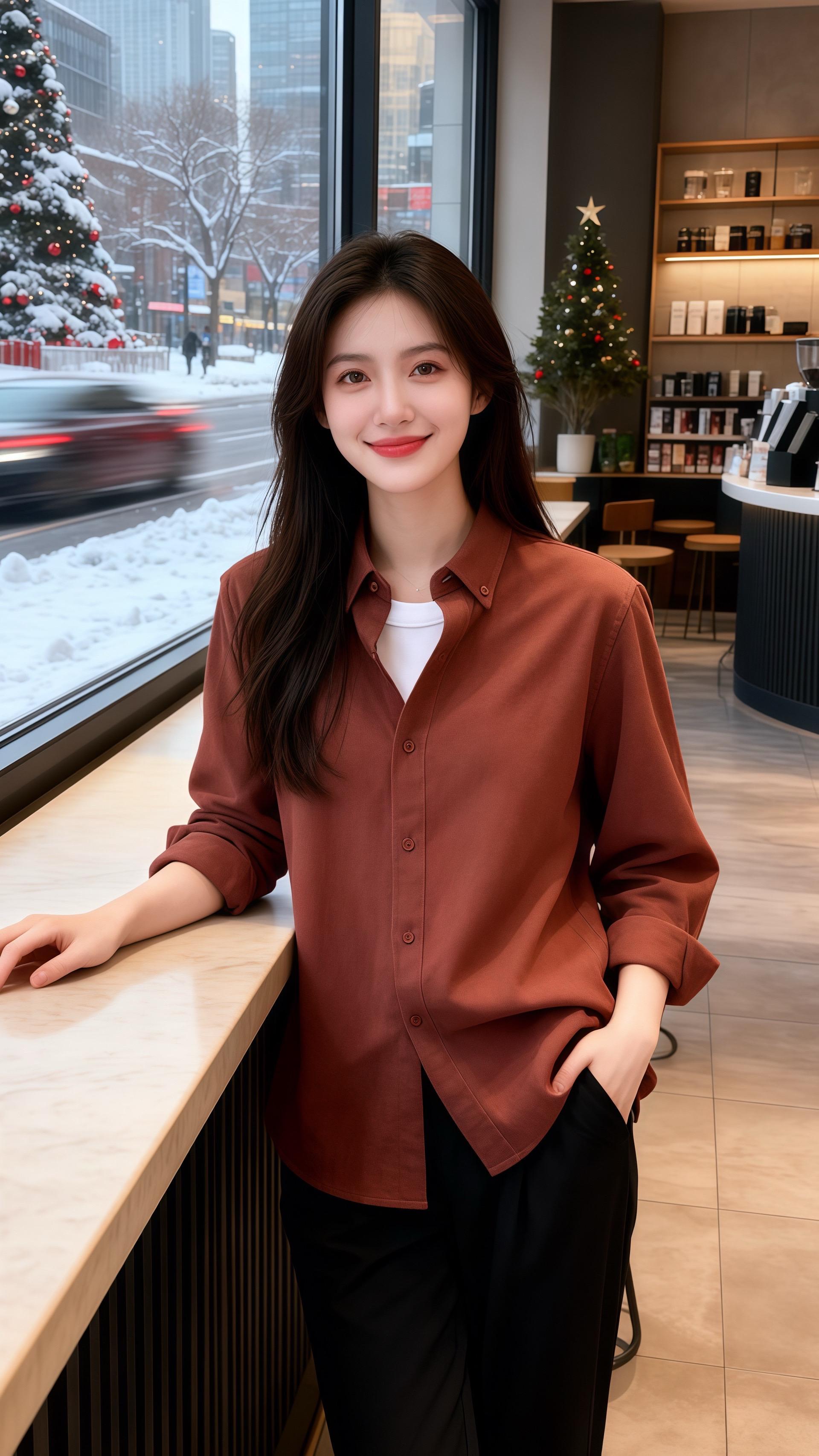 她穿红棕色宽松衬衫,面料带着细腻的哑光质感,领口微敞露出内搭的白T恤,简约的撞色衬得脖颈线条清隽,袖口随意挽到小臂,露出的手腕纤细,和下装的黑色长裤形成柔和的对比。裤型宽松却不拖沓,和衬衫的休闲感呼应,整身穿搭以红棕为主调,像冬日里热烘烘的焦糖布丁,暖调的色彩里藏着随性的温柔,让窗外的雪色都变得鲜活。