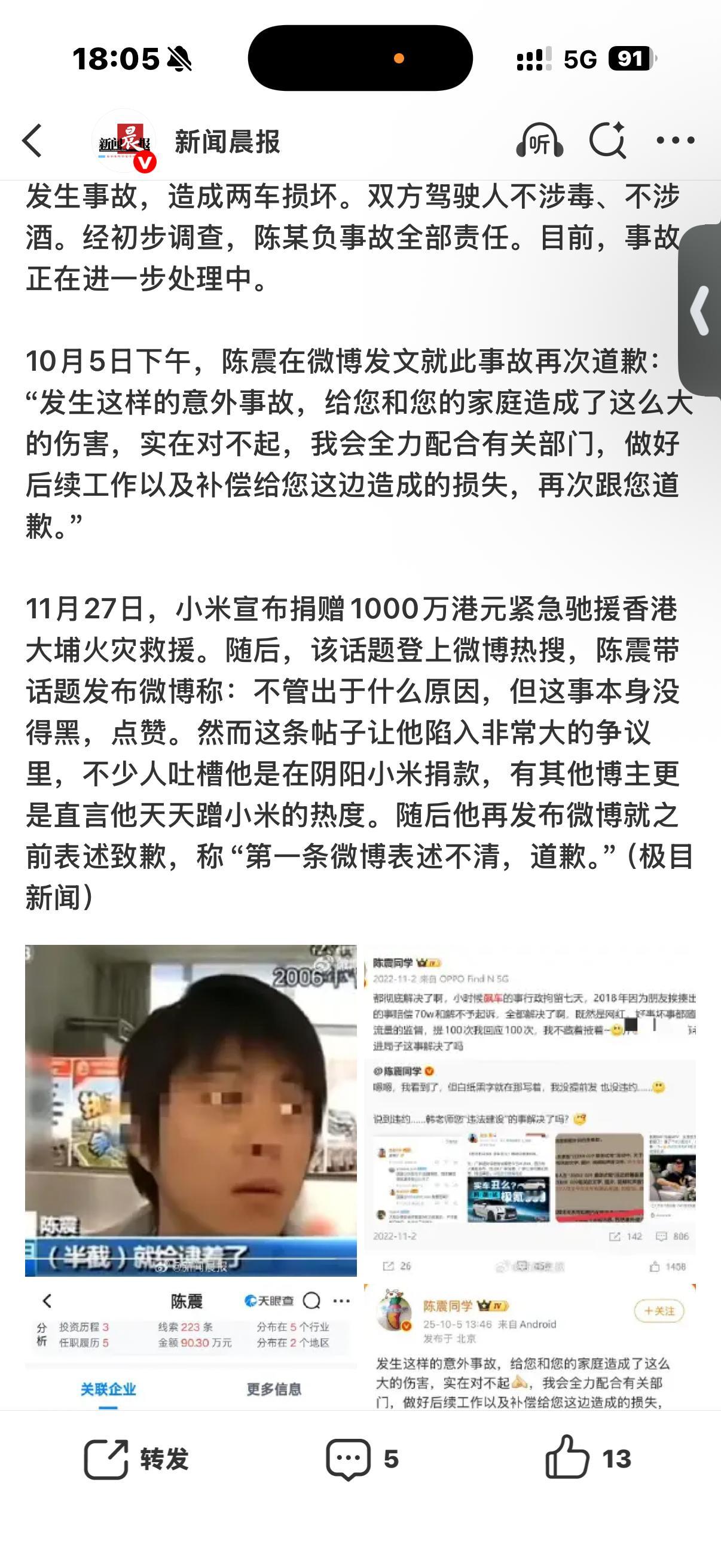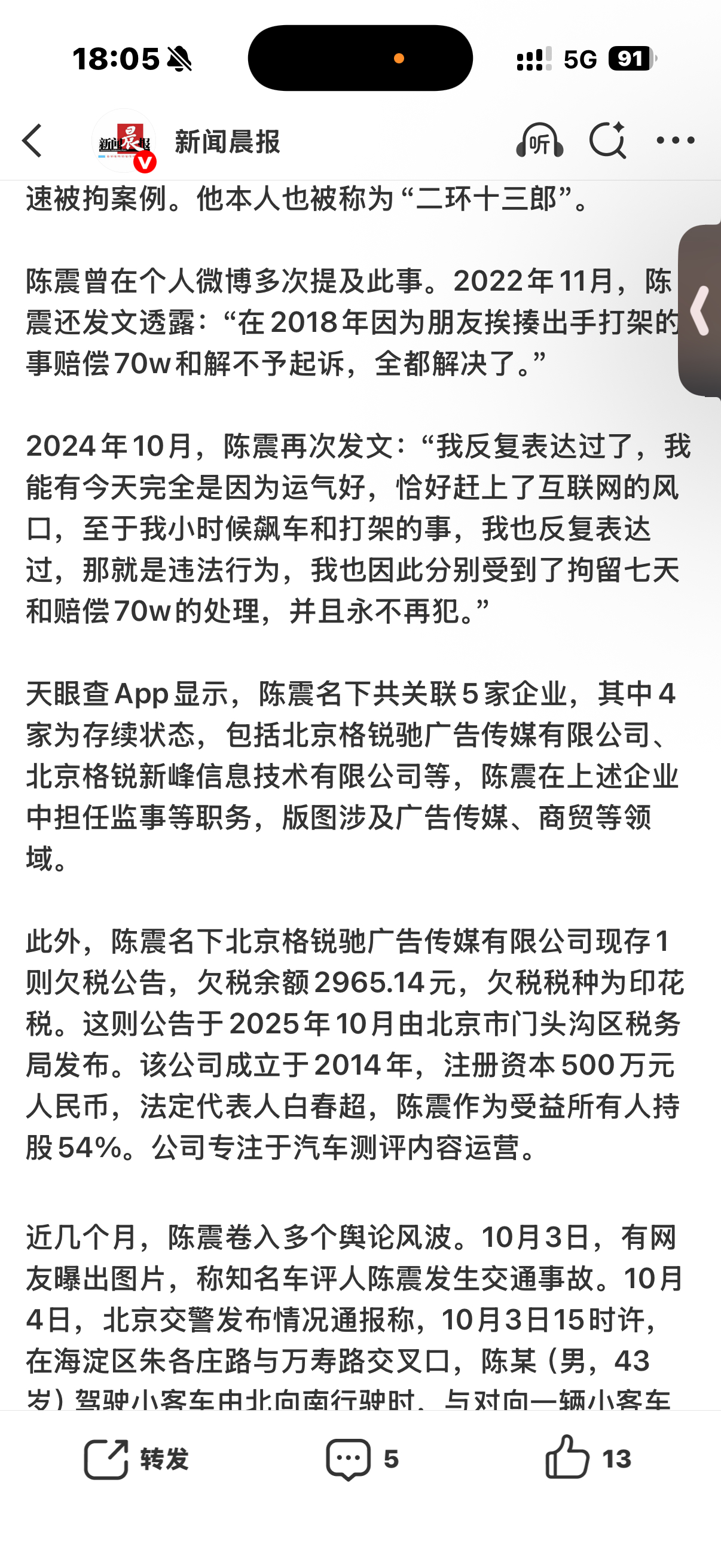 起底陈震陈震曾因飙车被行政拘留7天 2400万粉车评人屡踩法律红线!2006年飙车拘7天,创北京超速拘留首例;2018年打架赔偿70万,免于起诉仍不知戒;2024年逆行撞车,还公然鼓吹“只买交强险”;2025年曝偷税118万,追缴罚款合计247万+,名下公司欠缴印花税。公众人物当守底线,失德失范岂能纵容?我觉得该怎么罚就怎么罚,严于律己才能宽以待人