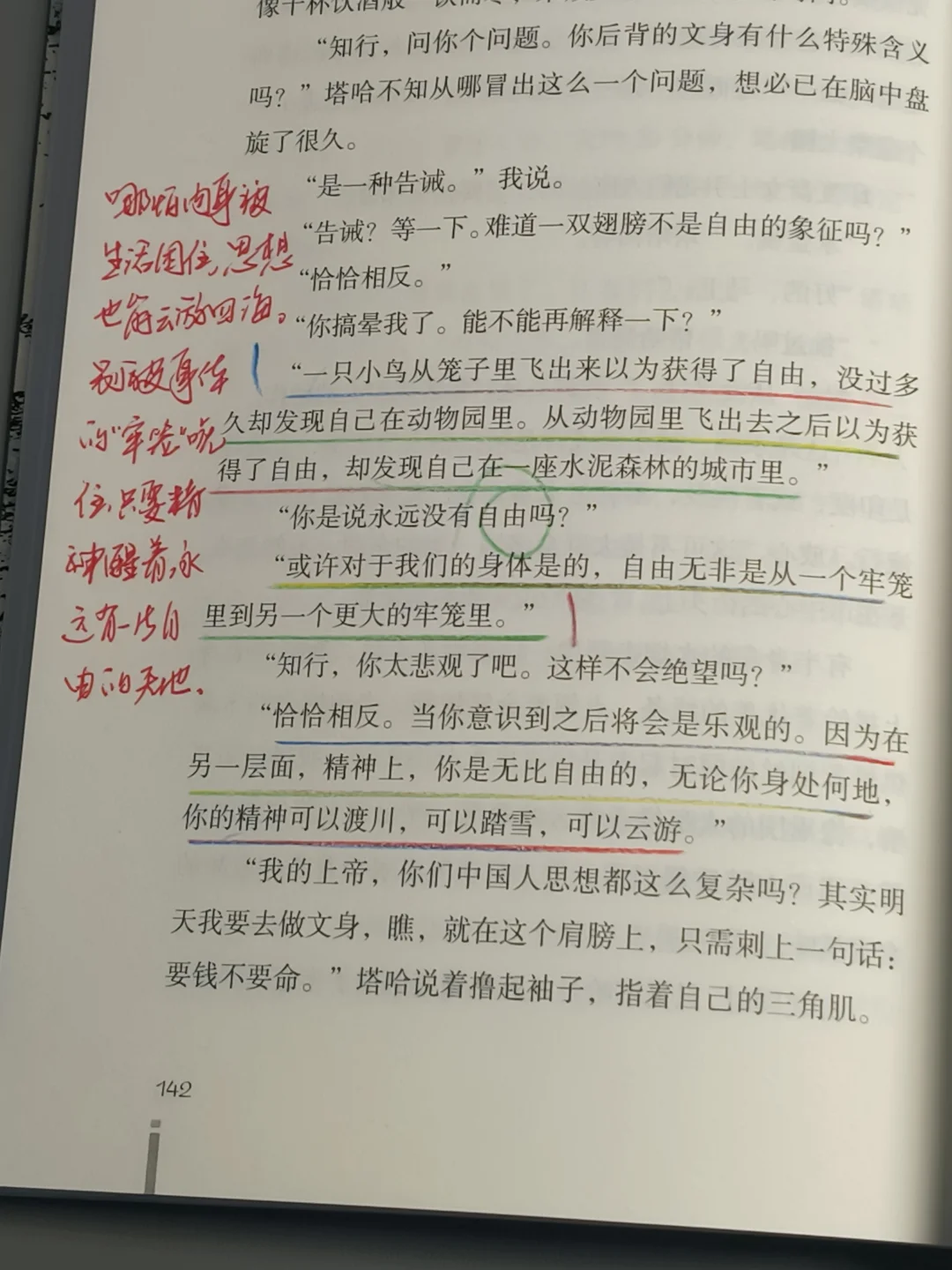 或许对于我们的身体是的,自由无非是从一个牢笼里到另一个更大牢笼里。另一层面,精神上,你是无比自由的,无论你身处何地,你的精神可以渡川,可以踏雪,可以云游。