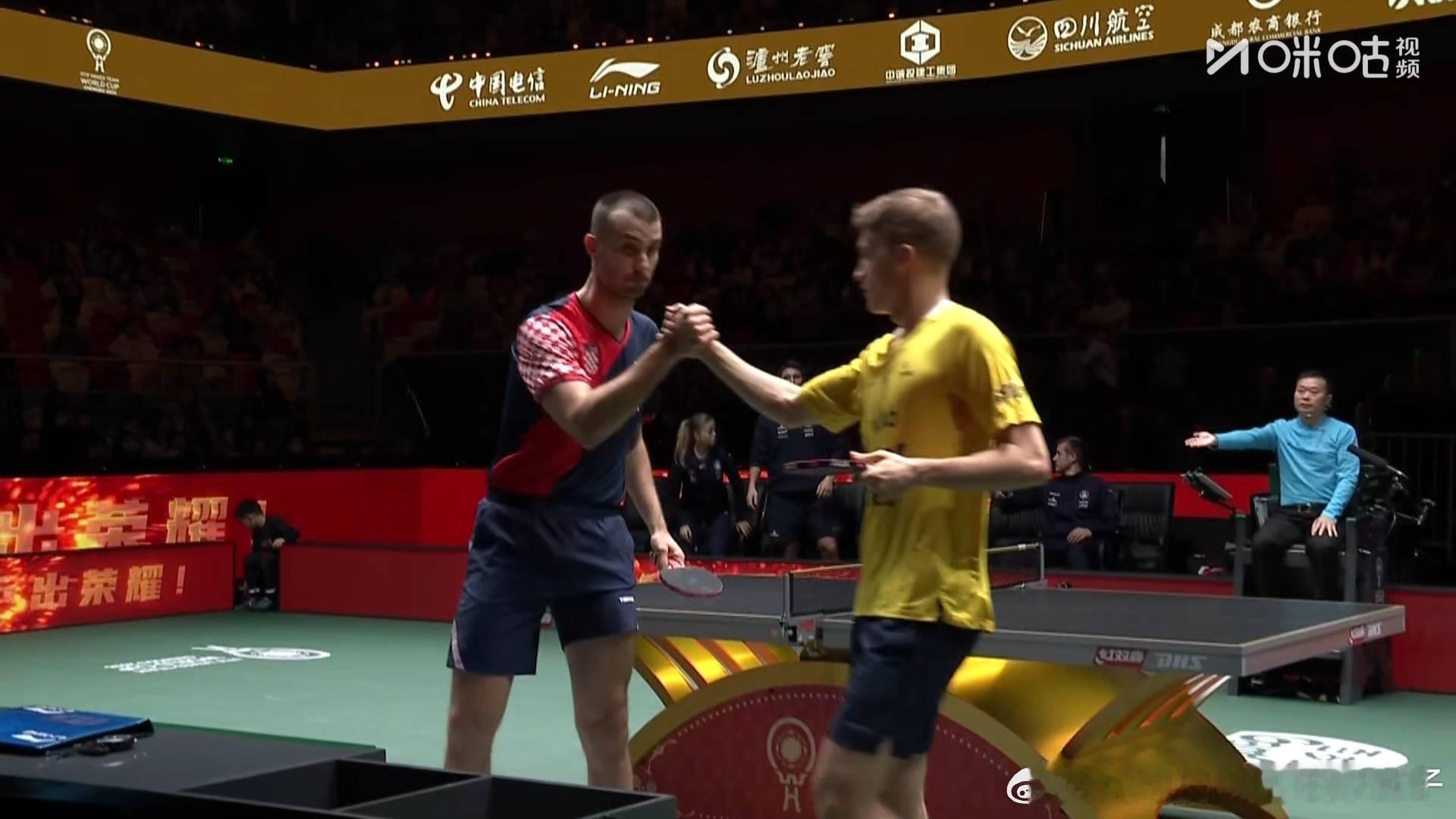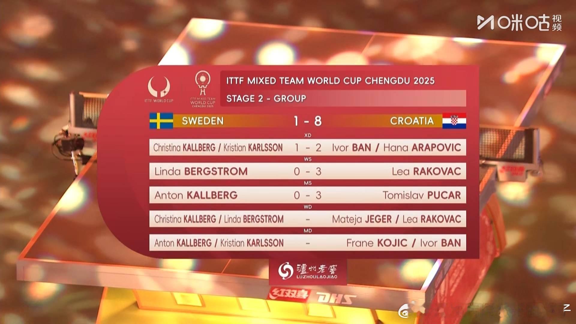 2025年国际乒联成都混合团体世界杯第二阶段:克罗地亚队🇭🇷八比一瑞典队🇸🇪伊沃本阿拉波维奇2比1卡尔松/克里斯蒂娜卡尔伯格(6,-11,7)拉科瓦奇3比0伯格斯特隆(9,9,7)普卡3比0安东卡尔伯格(8,9,8)