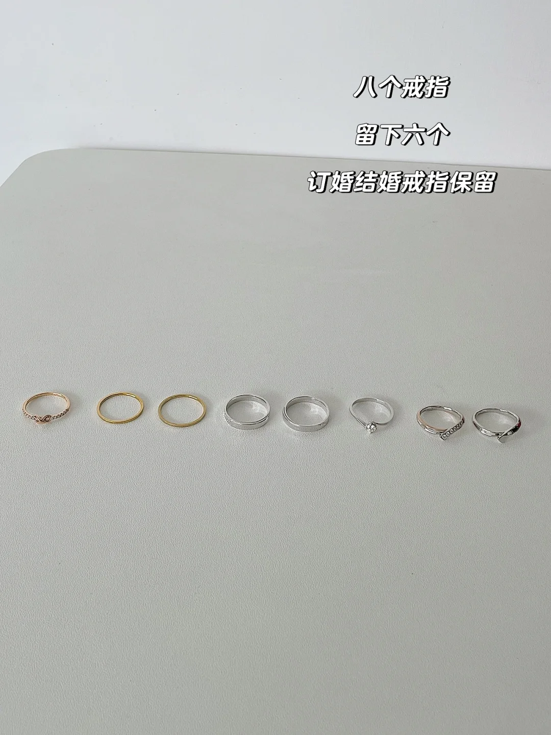 有两个戒指是韩代,平时工作会带,其他六个都是订婚结婚戒指,出席场合会带。戒指的挑选,特别是订婚戒指,选择的是小众品牌,一对组合起来是一个❤️,寓意很好,海外订做,三个月才漂洋过海到我手上,满意!