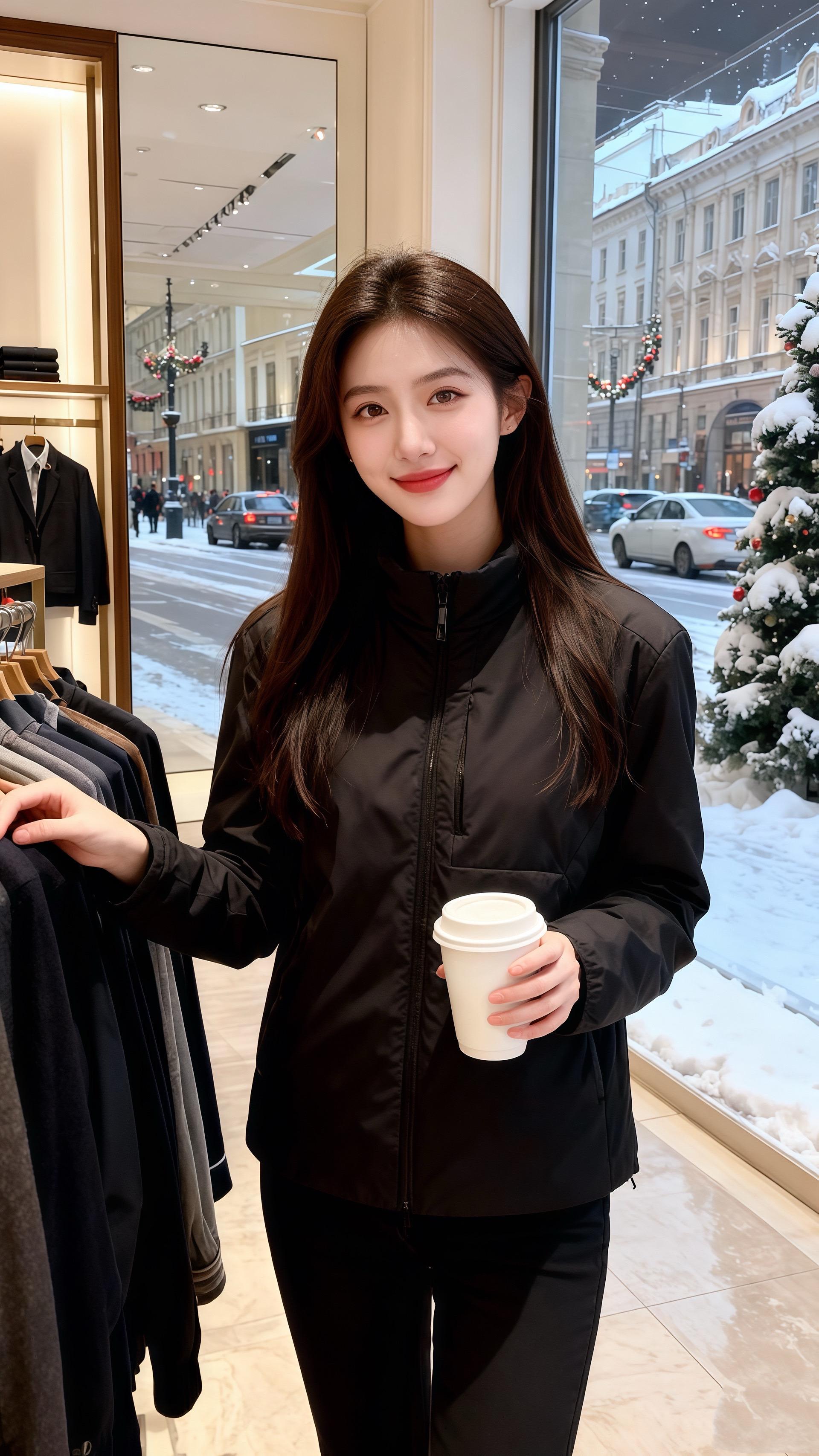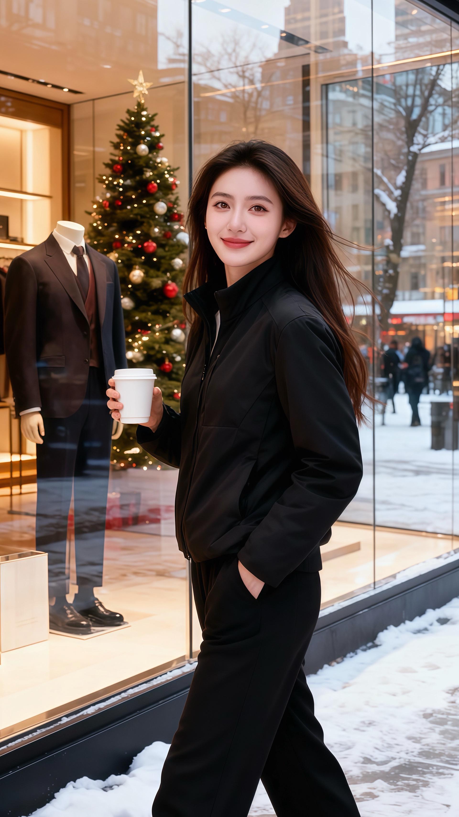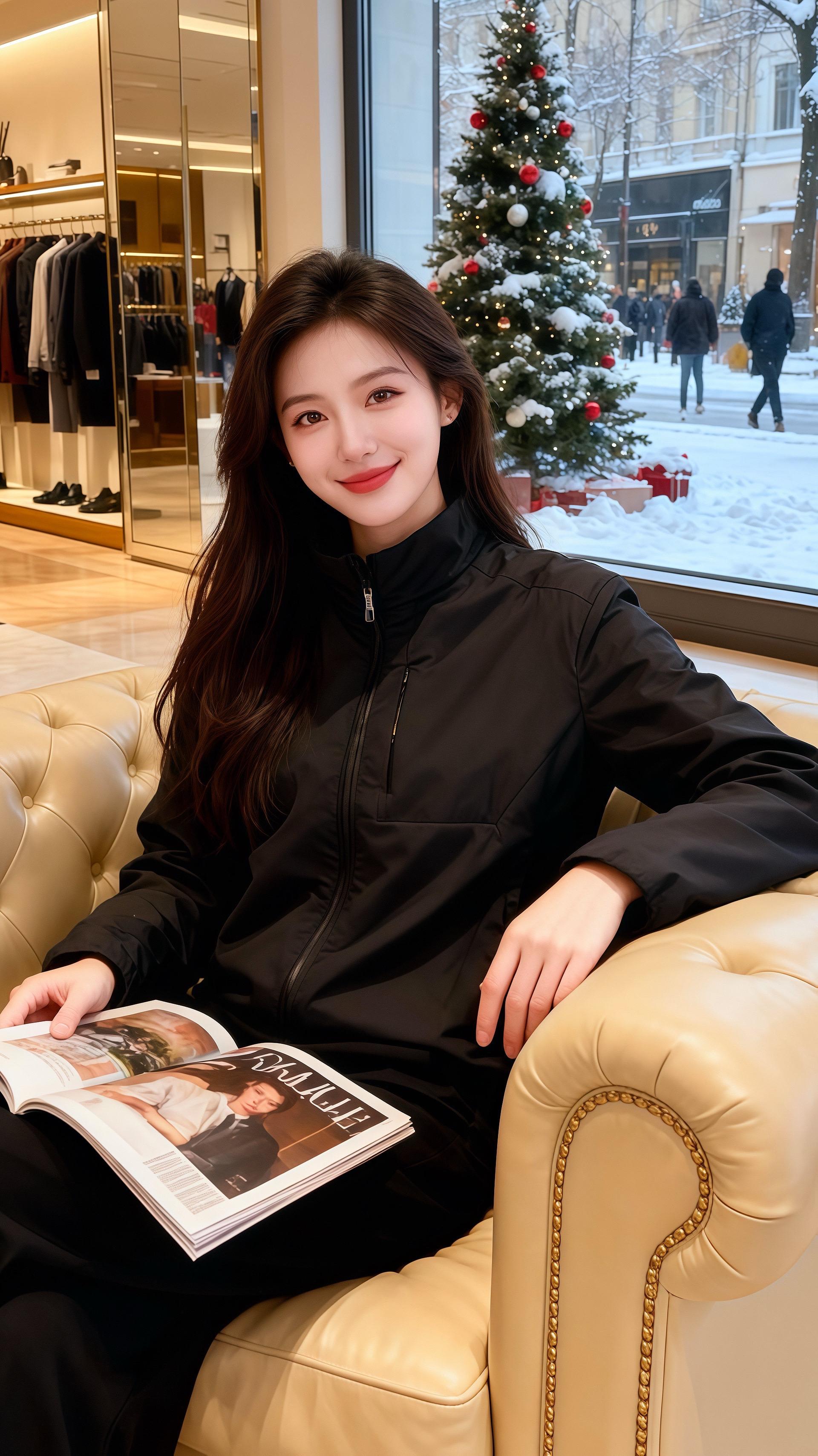 雪粒扑在男装店的玻璃橱窗时,许妍正指尖翻着时尚杂志——黑色立领夹克的拉链半开,同色系的裤子顺着腿线垂落,冷调的黑裹着肩线,像把冬日的圣诞街景揉出了利落的轮廓。