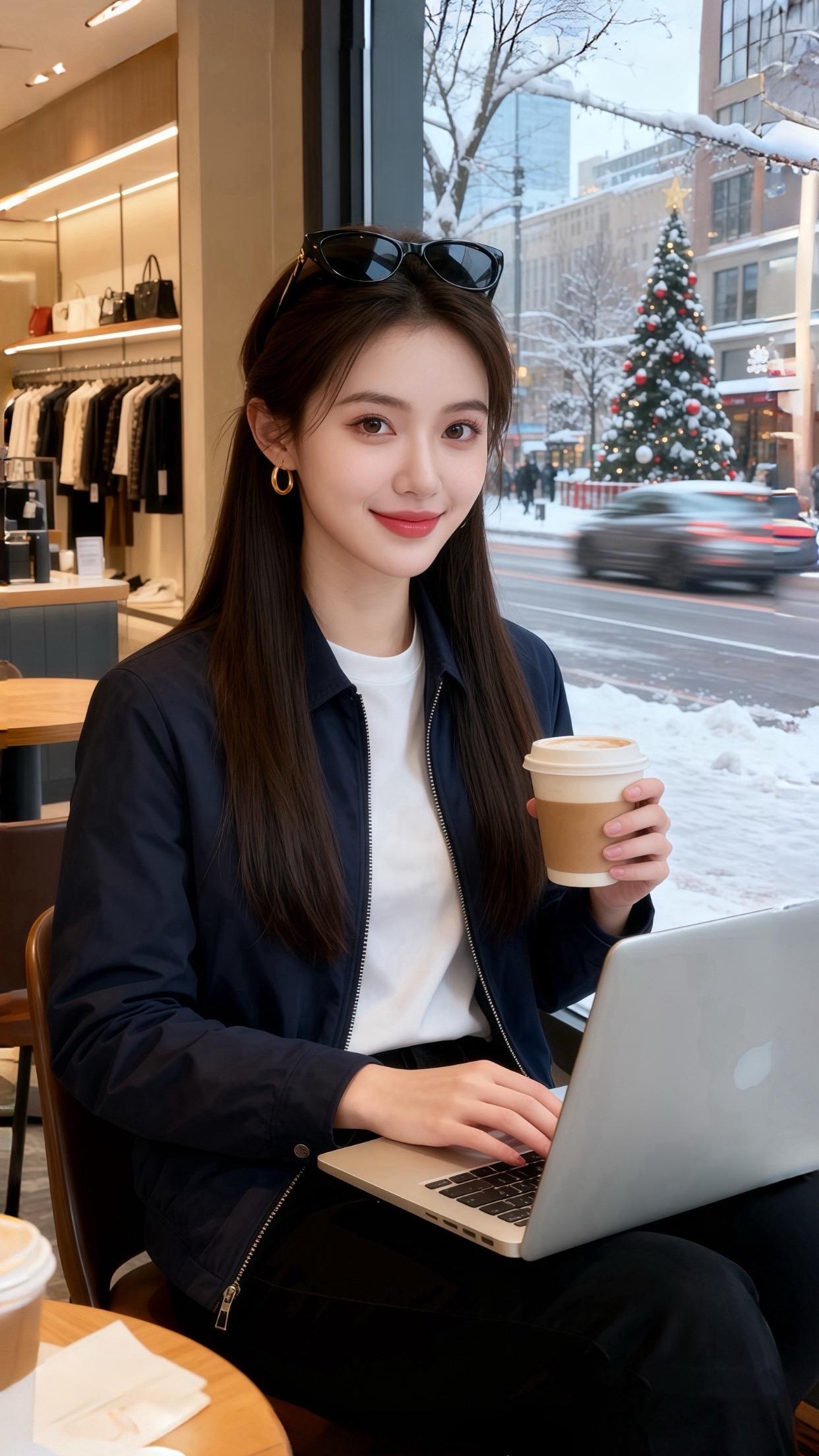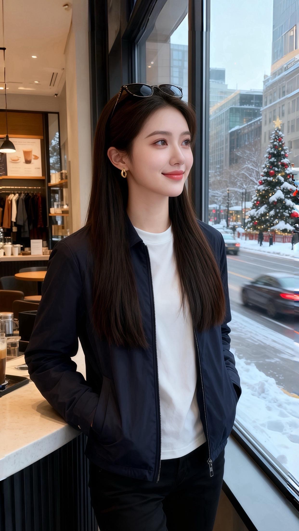 雪粒扑在男装店的玻璃橱窗时,许妍正指尖碰着藏青夹克的拉链——和她身上这件同款,挺括的翻领衬着内搭的白T恤,冷调的藏青撞着软白,像把冬日的圣诞街景揉出了利落的轮廓。
