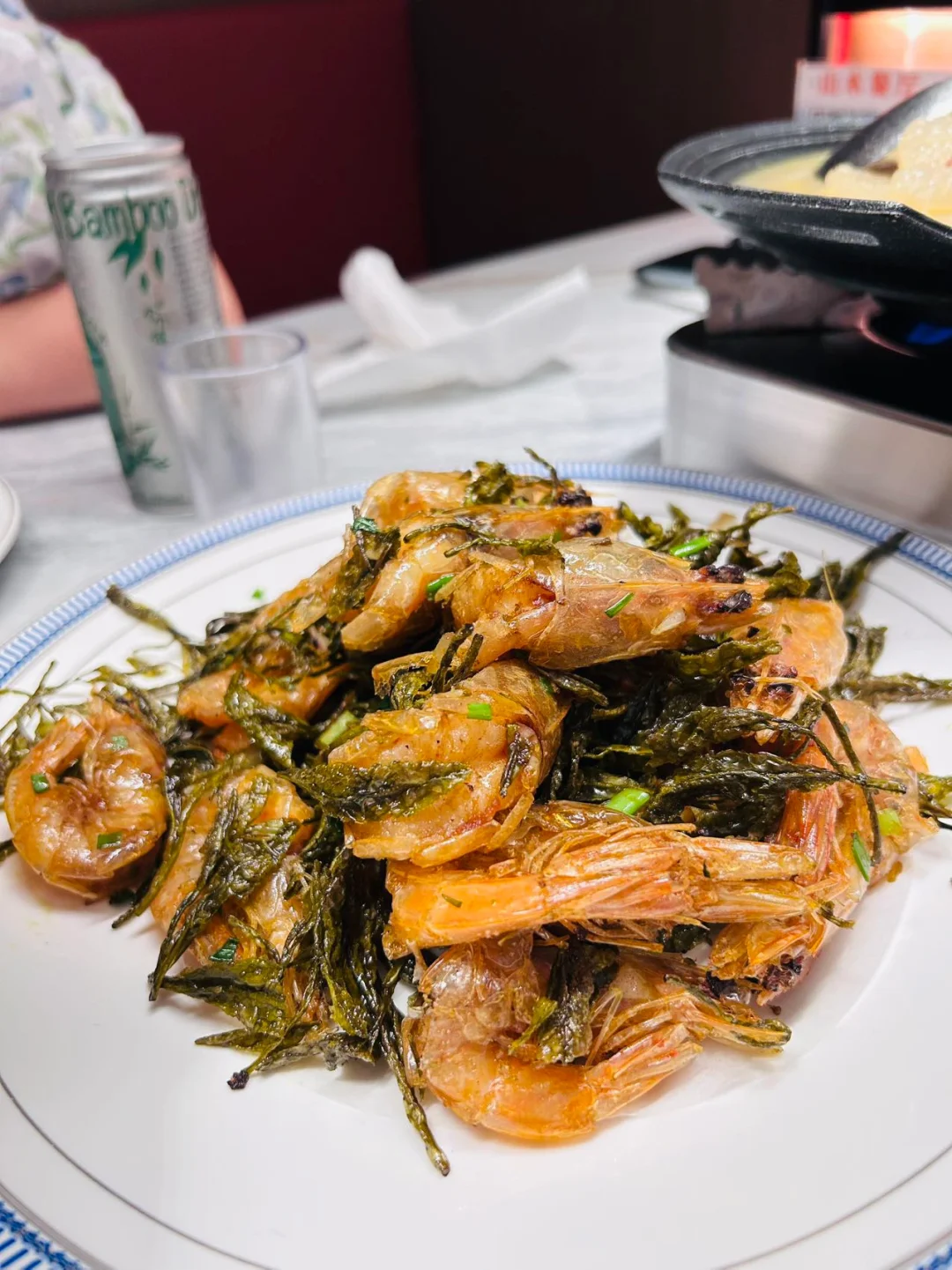 【安吉白茶大虾】安吉白茶和大虾的组合,每一只大虾都带着茶香,口感太jue了👍油爆后的白茶也可吃,非常酥脆。