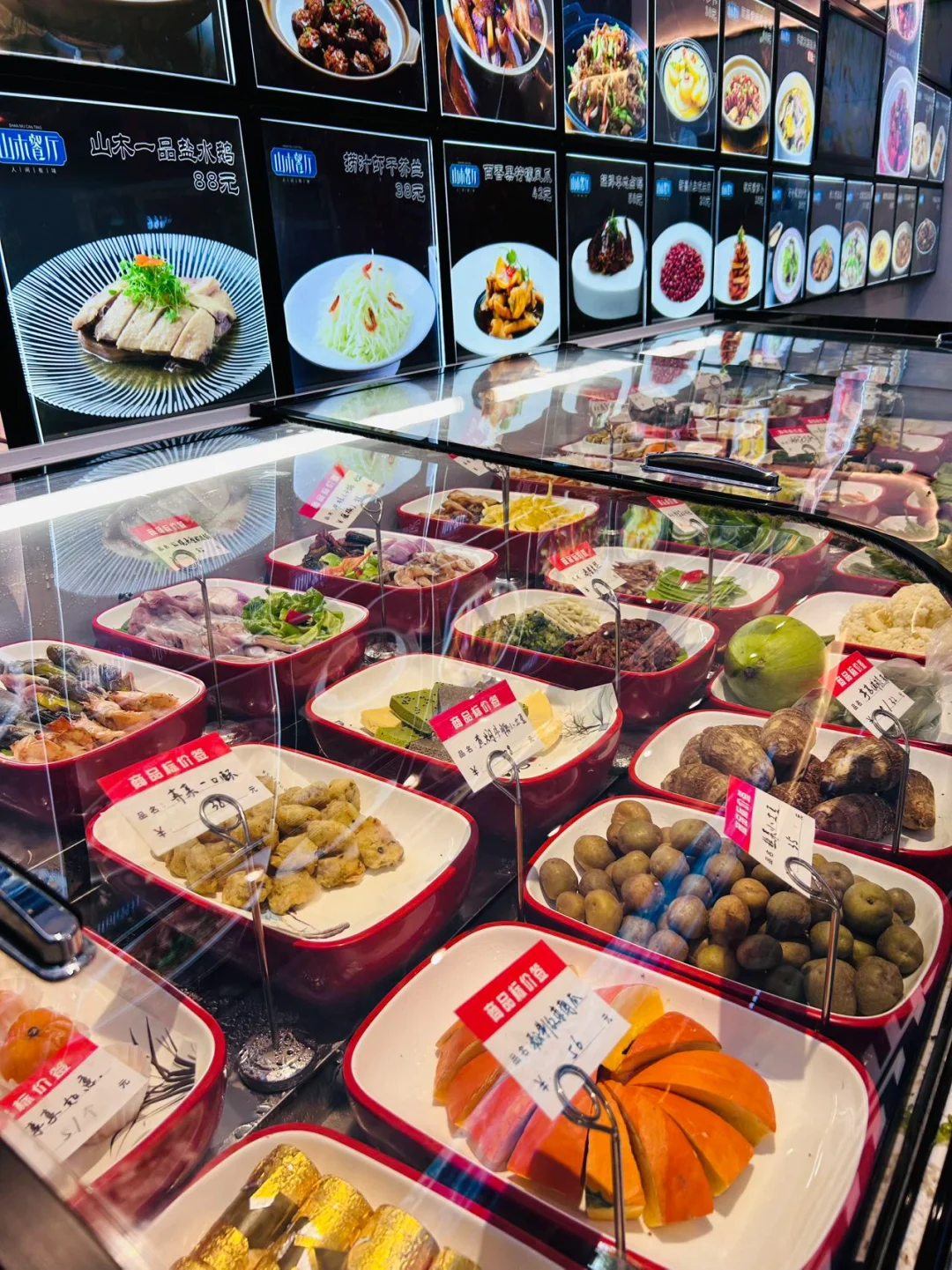 新鲜的食材摆满了入口处,一盘盘搭配好的菜肴整齐地摆在冷藏柜里,河鲜海鲜都是活的养在水里,每种都很新鲜。