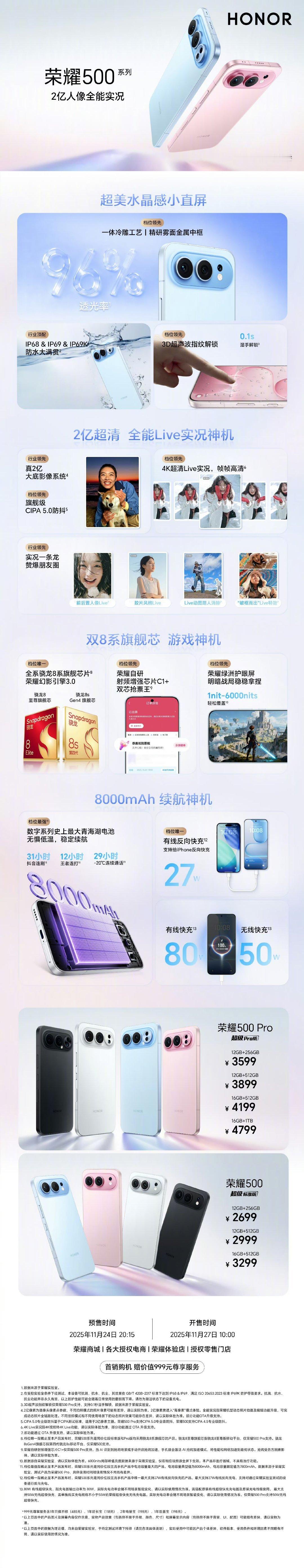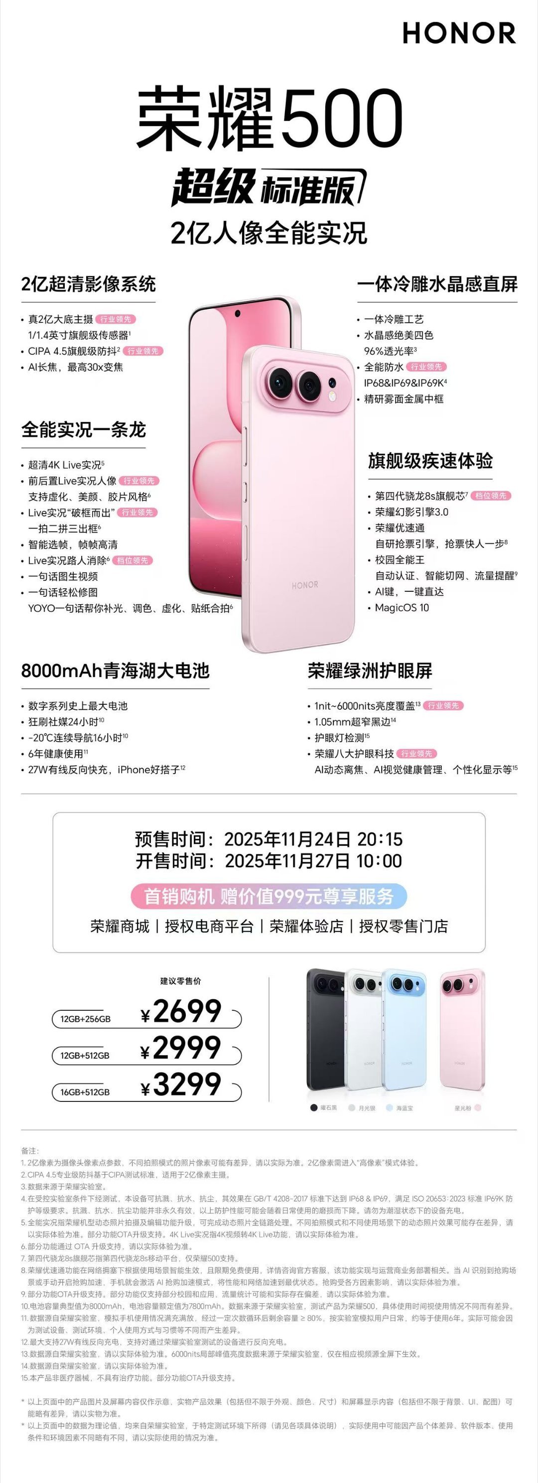 一图读懂荣耀500系列,超级标准版,超级Pro版!!!超美水晶感小直屏,档位领先一体冷雕工艺,全系透光率高达96%!行业顶配IP68&IP69&IP69K 防水防尘大满贯!2亿超清全能Live实况神机,实况一条龙,赞爆朋友圈!双8系旗舰芯,游戏神机!8000mAh青海湖大电池,续航神机!性能全面进阶!肖战同款荣耀500发布全系预售已开启荣耀500荣耀500价格荣耀500起步即超标肖战同款荣耀500发布荣耀500超级pro