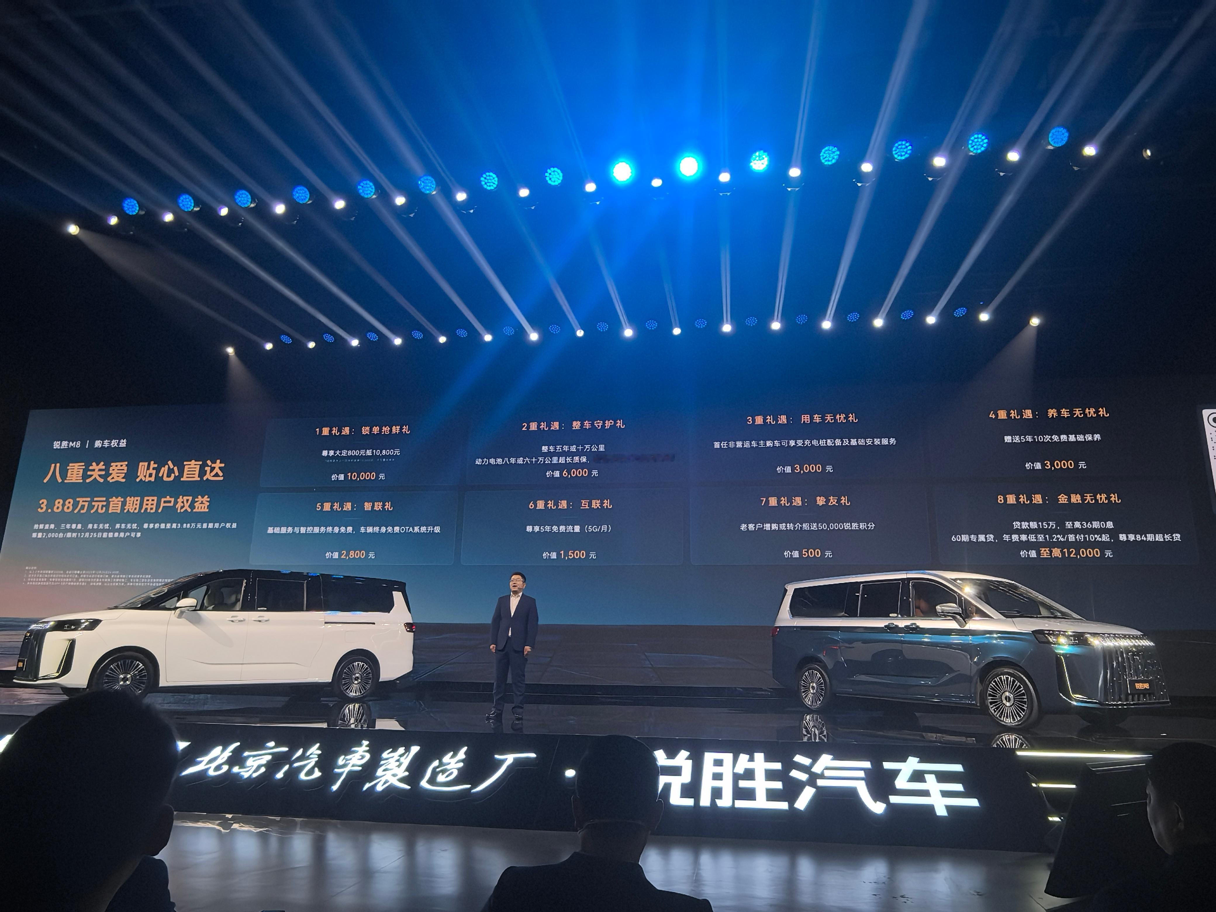 12月5日,北京汽车制造厂旗下全新MPV车型锐胜M8 正式上市,新车共推出8款车型,优惠价售12.98万-19.98万元。作为品牌旗下定位中大型MPV的战略产品,锐胜M8有哪些新车亮点?我们一起来为大家新车划重点1、外观设计上,锐胜M8采用大尺寸直瀑式镀铬前格栅,并与两侧头灯组融为一体,配合可选的双色车身涂装,展现出兼具商务与时尚气息的视觉风格;2、车身尺寸方面,新车的长宽高分别为5317/1870/1955毫米,轴距达到3200毫米。车内总容积高达6180L;3、内饰采用环抱式座舱布局,搭载悬浮式全液晶仪表盘与中控屏。内置高通骁龙8155车规级芯片,并支持地平线L2级辅助驾驶功能。新车提供黑色/琥珀橙与黑色/量子灰两种内饰配色,并可选装Jamo尊宝音响系统、后排小桌板、2.2千瓦对外放电等配置;4、座椅布局上,锐胜M8提供7座与9座两种选择,其中第二排为双独立电动座椅,支持腿托、通风、加热及按摩功能,配合7层材质的人体工程学设计,进一步提升了乘坐舒适性;5、纯电版搭载最大功率170千瓦的单电机,提供81kWh与92kWh两种磷酸铁锂电池选项,CLTC续航分别为505公里与560公里。增程版则搭载1.5T增程器与后置单电机,电机功率同样为170千瓦,配备46kWh三元锂电池与65升油箱,CLTC纯电续航230公里,综合续航可达1420公里。