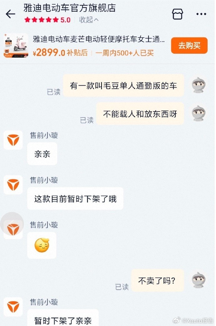 雅迪毛豆车型 12月5日,梨视频报道,雅迪电动车就旗下“毛豆”新国标车型被指“不能带小孩”、“缺乏储物空间”等致歉。并表示,目前已上市的为“单人通勤版”,主要服务于日常单人通勤群体,侧重解决基础出行需求。此外,同系列产品还包括“时尚版”与“亲子宝妈版”,优化后也将陆续上市。针对“雅迪新国标电动车争议”一事询问客服,雅迪电动车官方旗舰店客服回应称,涉事电动车车型已暂时下架,暂未接到上架通知,线下门店是否在售尚不清楚。问及该款车型是否因吐槽太多而被下架,客服未正面回应,仅回复一个笑哭表情。雅迪电动车致歉雅迪争议电动车已下架