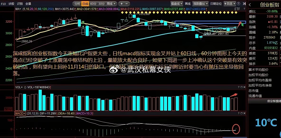 热点方面,今天商业航天继续走强并大涨,仍然是十五五政策催化及太空算力部署预期,量价配合健康,资金继续流入,有望冲前高了,该板块已经成为近期市场毫无争议的主线了。人形机器人板块今天也有持续性表现,中美机器人已经摆在台面上较量,该板块是大题材,行业空间很大,未来制造业将用到大量人形机器人,美国如果要重振制造业也必须用人形机器人替代人,目前中美机器人发展水平在同一起跑线上,美国那边已经出政策要大力发展,未来中国能否把机器人做好关系到当前制造业地位的维持甚至国运,所以我认为该板块未来是有可能再度成为主线的,须持续跟踪关注。另外就是证券板块下午出现明显的异动拉升,该板块已经提前叫大家逢低打埋伏了,近期做出底背驰诱空结构后这两天收评中提示了加仓条件,但这个板块只适合埋伏,不适合追高,如果尾盘再追就有些偏晚了,下周补掉上方缺口后可能转为震荡消化了,所以节奏上要注意一下。