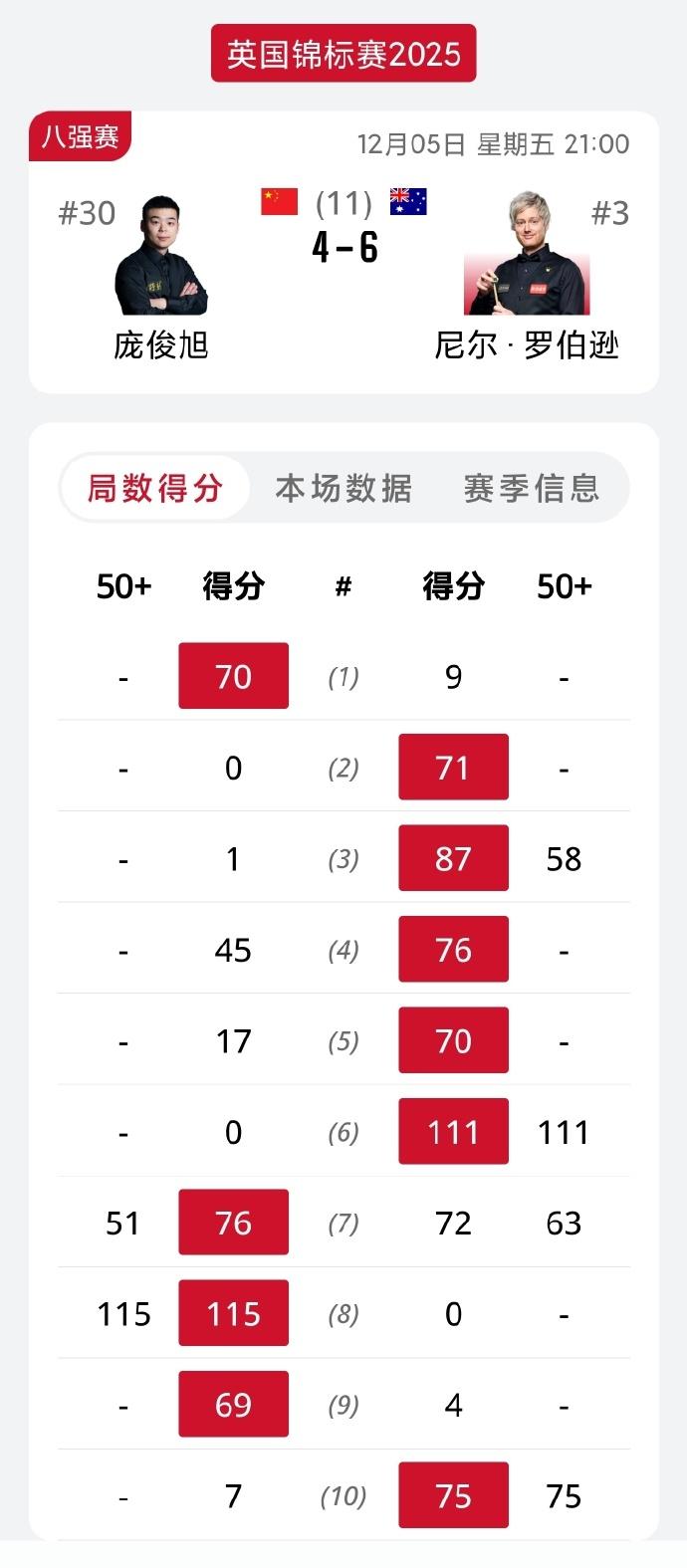 直播吧12月06日讯2025斯诺克英锦赛1/4决赛,全场比赛,尼尔·罗伯逊打出一杆111分和三杆50+(58、63、75),庞俊旭打出一杆115分和51分。
