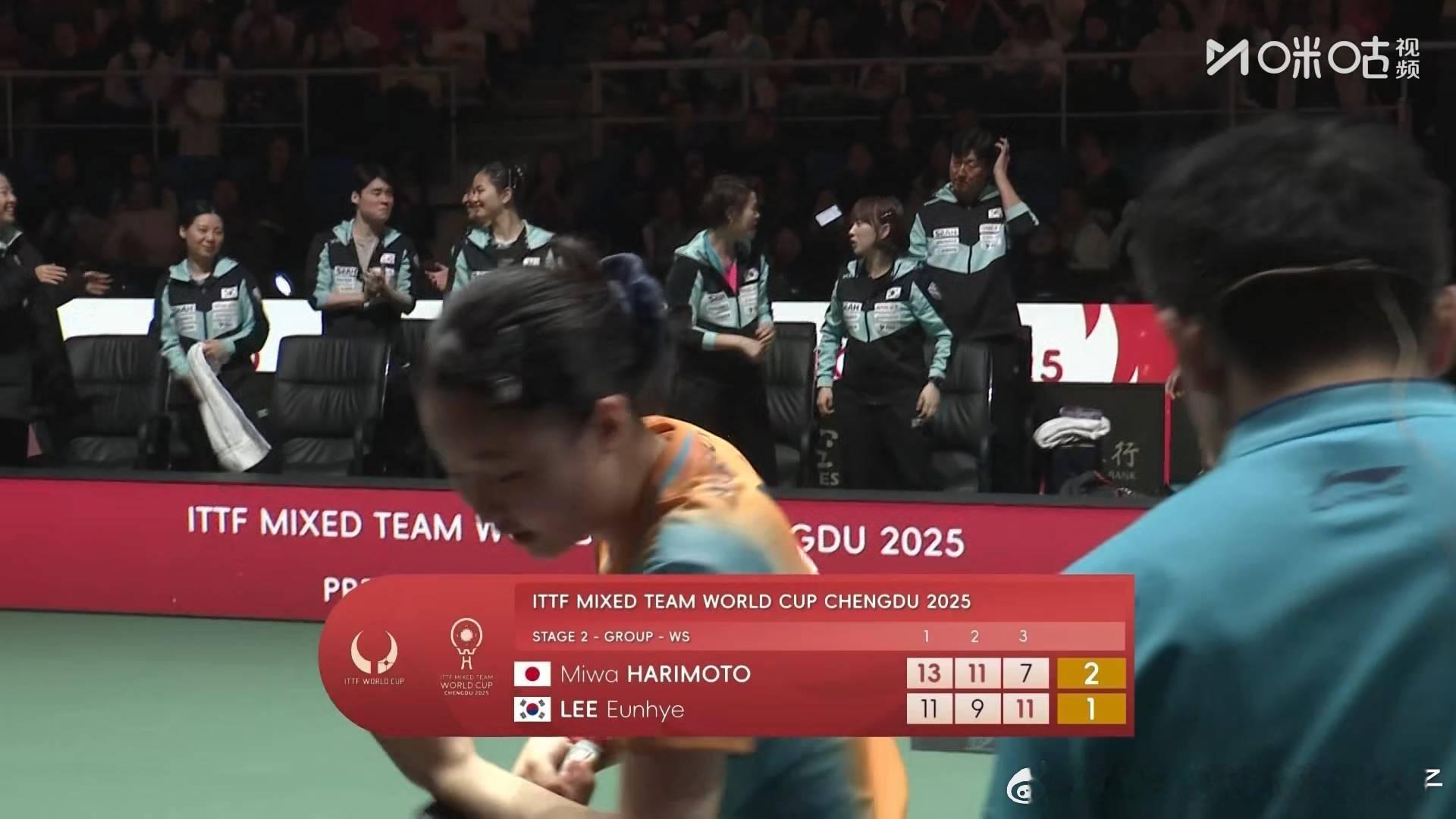 张本美和2比1李恩慧(11,9,-7)第三盘:松岛辉空VS安宰贤日本队四比二韩国队2025年国际乒联成都混合团体世界杯第二阶段