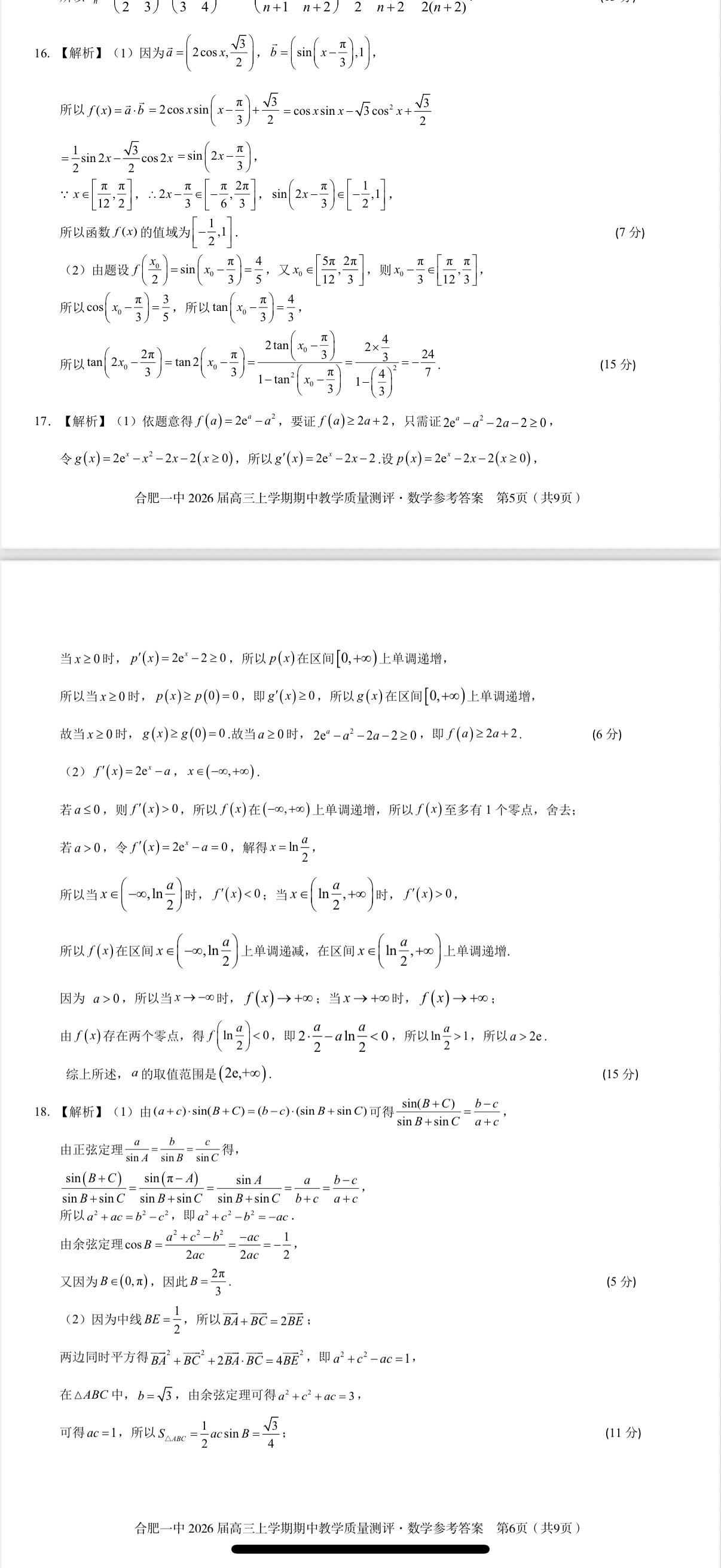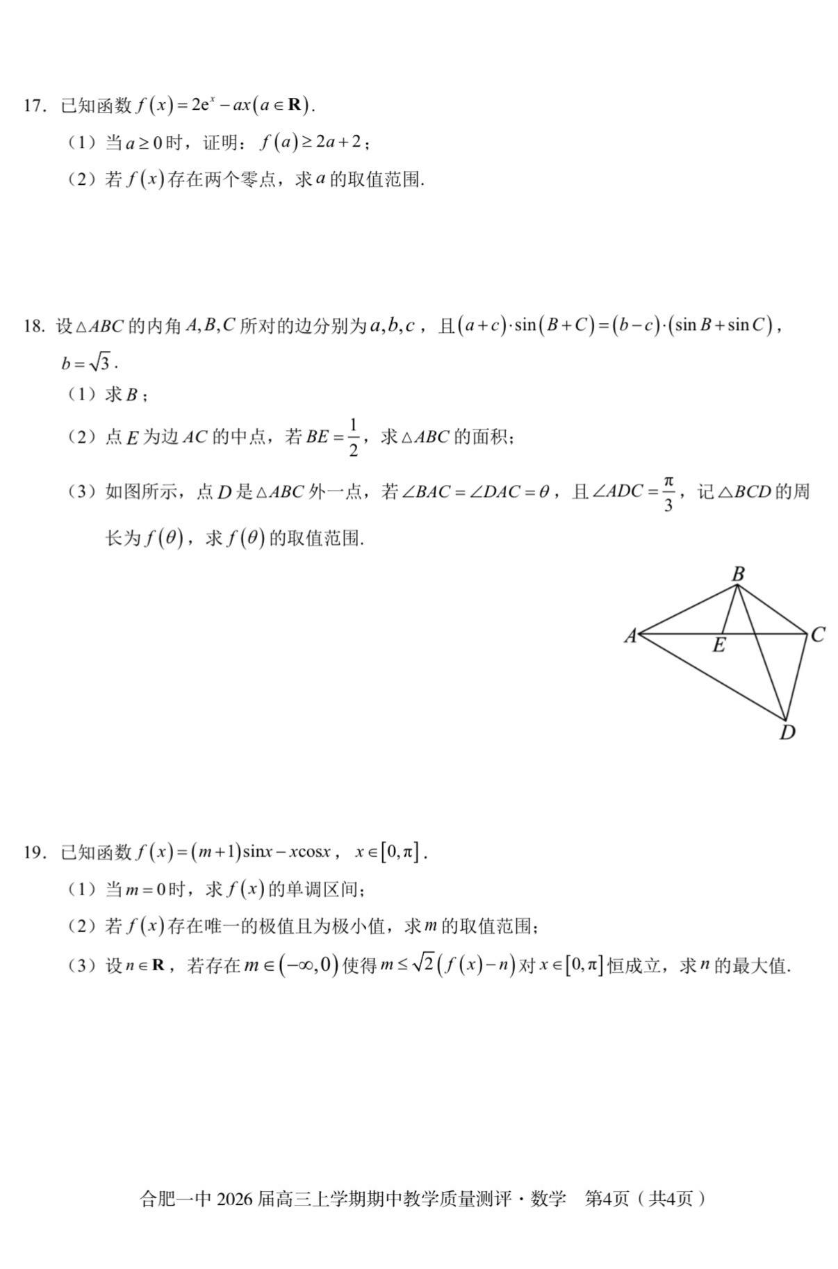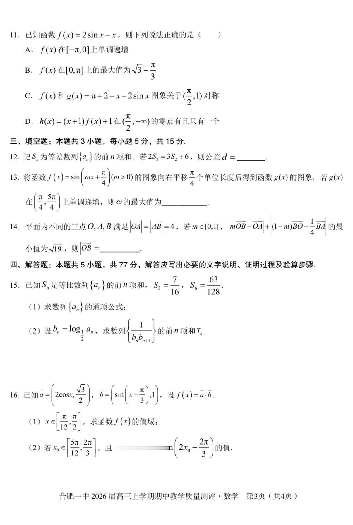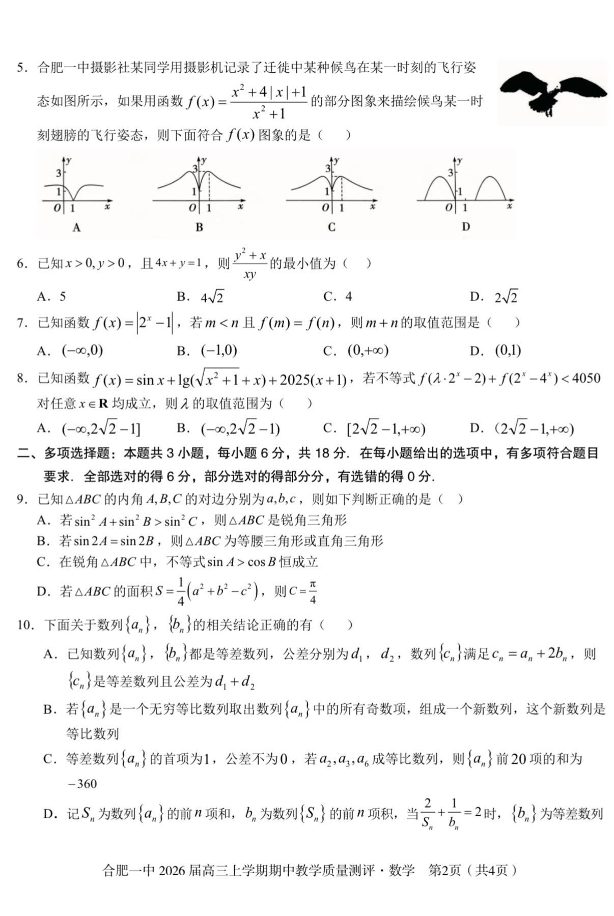 合肥一中2026届高三上期中考试数学试题及答案,省内大部分高中都参加江...