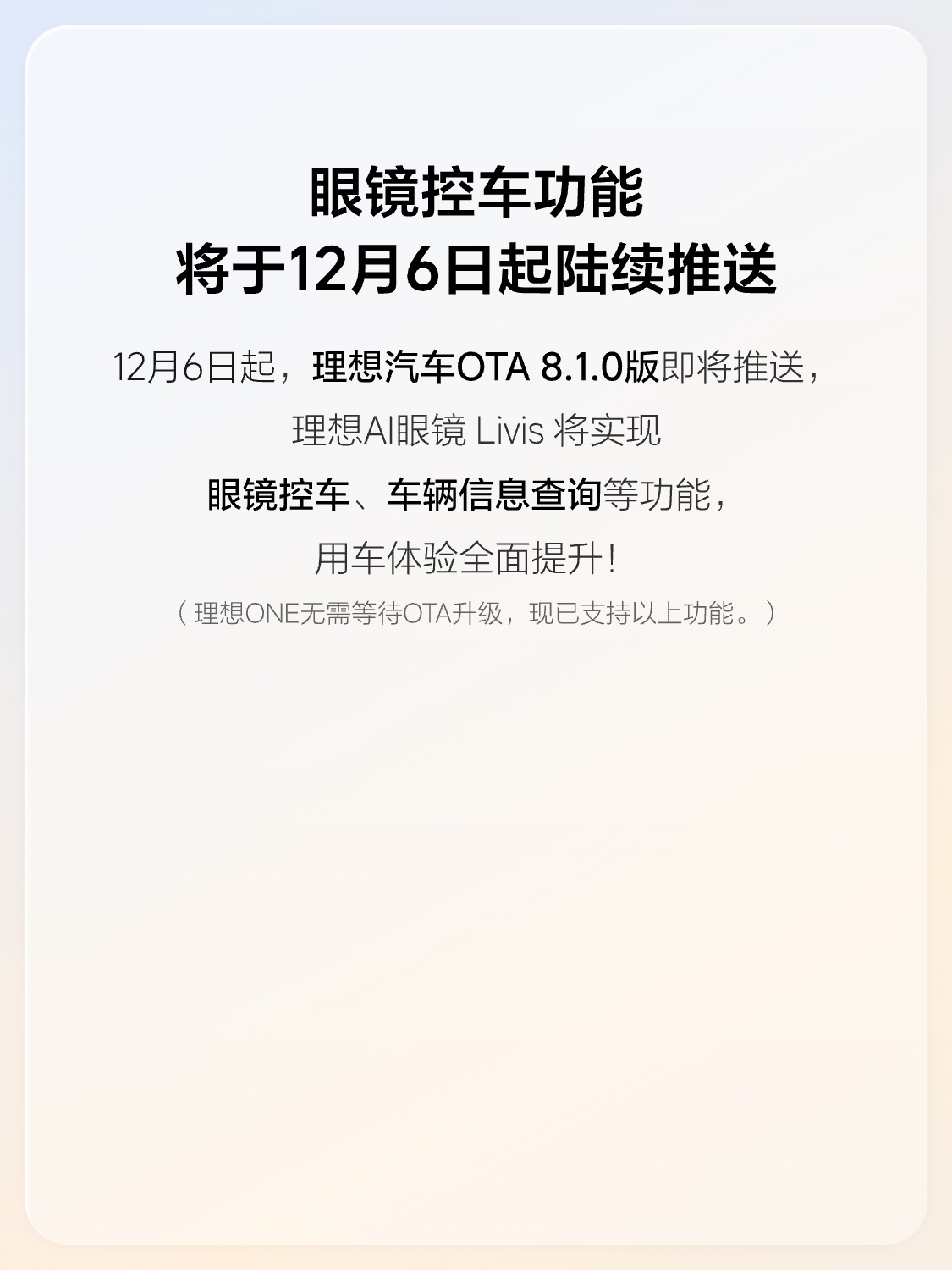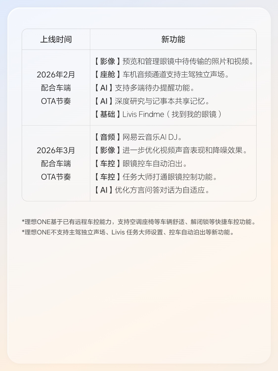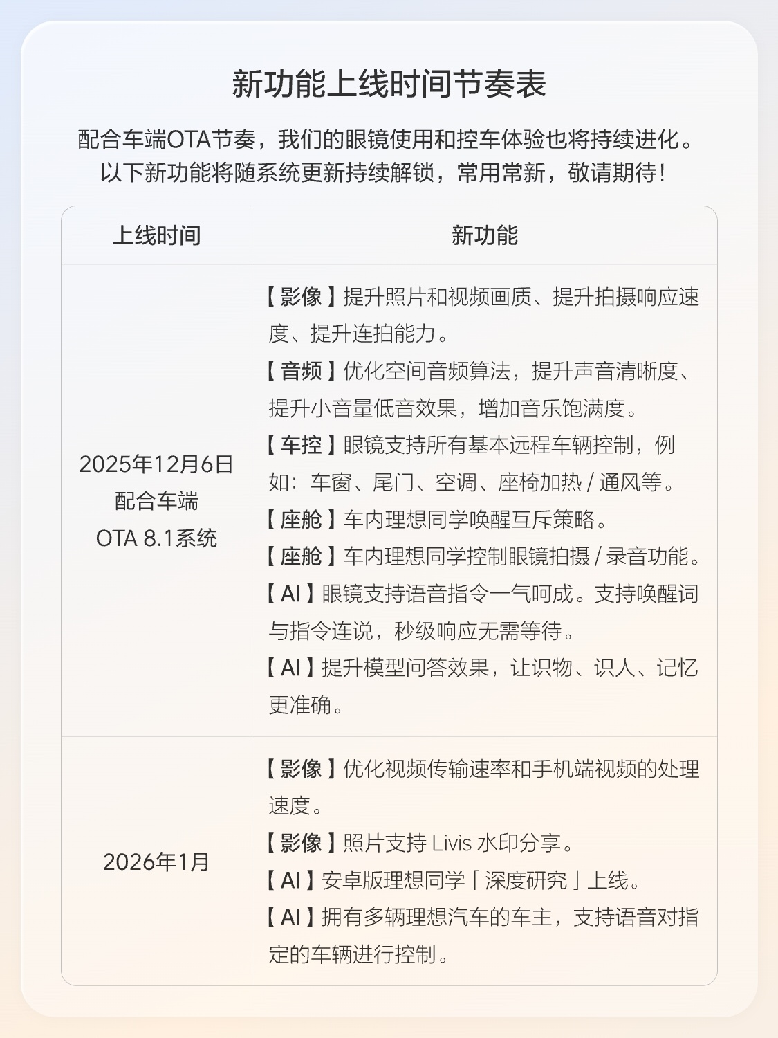 理想眼镜和车机连动的开发节奏来了:12月6日OTA8.1版本,更新功能,眼镜和车机语音交互优化,基础控车能力26年1月更新语音控车能力,优化传输性能,支持拍照水印26年2月“头枕音响功能”以及寻找眼镜功能上线26年3月控车泊出车位功能上线……