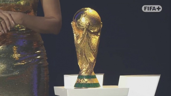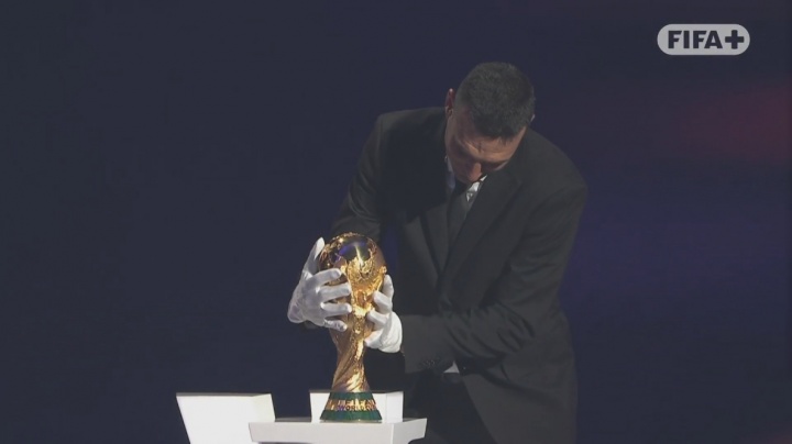 真品!世界杯抽签仪式上,卫冕冠军主帅斯卡洛尼将大力神杯送还