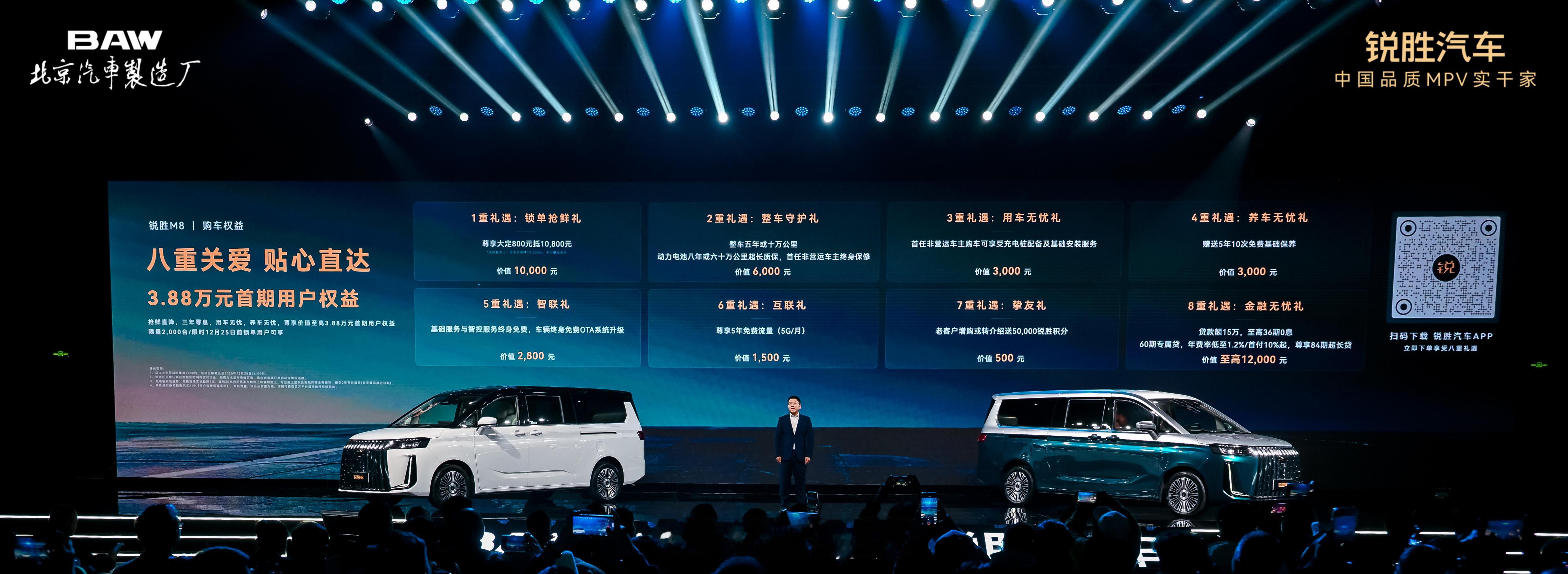 锐胜汽车推出了其首款全场景大型 MPV—— 锐胜 M8,补贴售价 12.98 万元!新车长度 5,317 mm,轴距 3200mm。空间方面,二排最大腿部空间达到 630mm,三排则为 610 mm,乘员舱在满足 7 个 1.8 米成年人舒适乘坐的条件下,行李箱还能容纳 18 个标准 20 寸行李箱。动力续航方面,锐胜 M8 提供增程、纯电和燃气三种动力模式,增程版的 CLTC 综合续航高达 1,420 km,并配备最大 46 kWh 4C 超充电池,30%-80% 补能仅需 10 分钟。纯电版最高续航 560 km,充电 20 分钟即可续航 330 km。配置方面,高通骁龙 8155 芯片 + 14.6 英寸中控屏,还有地平线 L2 级辅助驾驶系统。锐胜 M8 还提供 7 座和 9 座两种座椅形式。大家觉得这个价格有性价比吗?42how新能源汽车锐胜M8人人皆上座