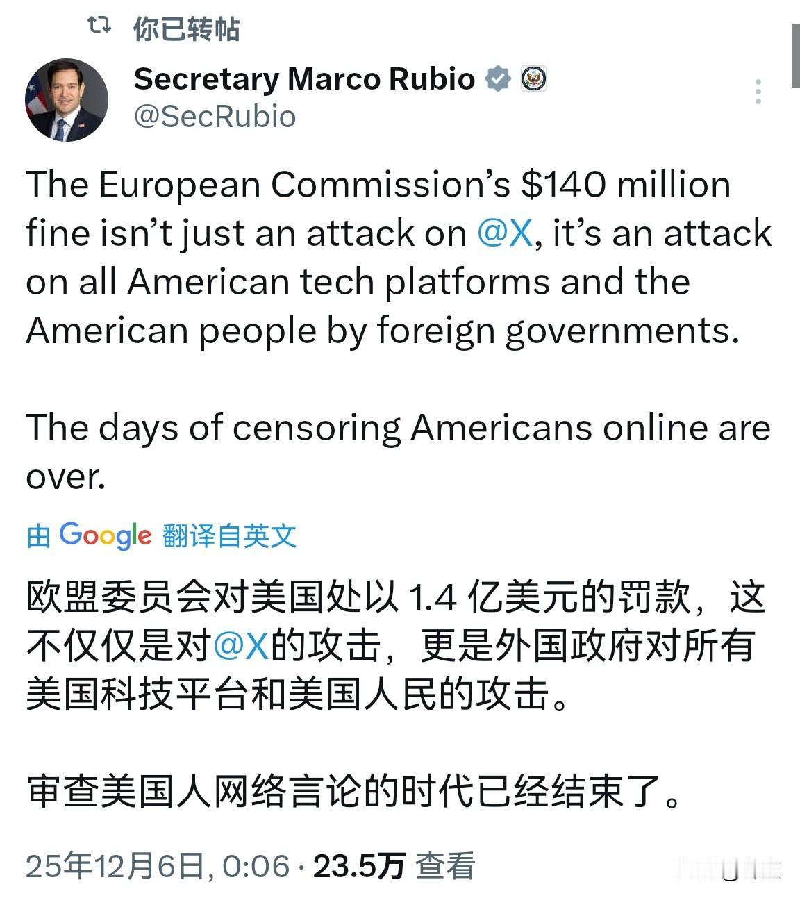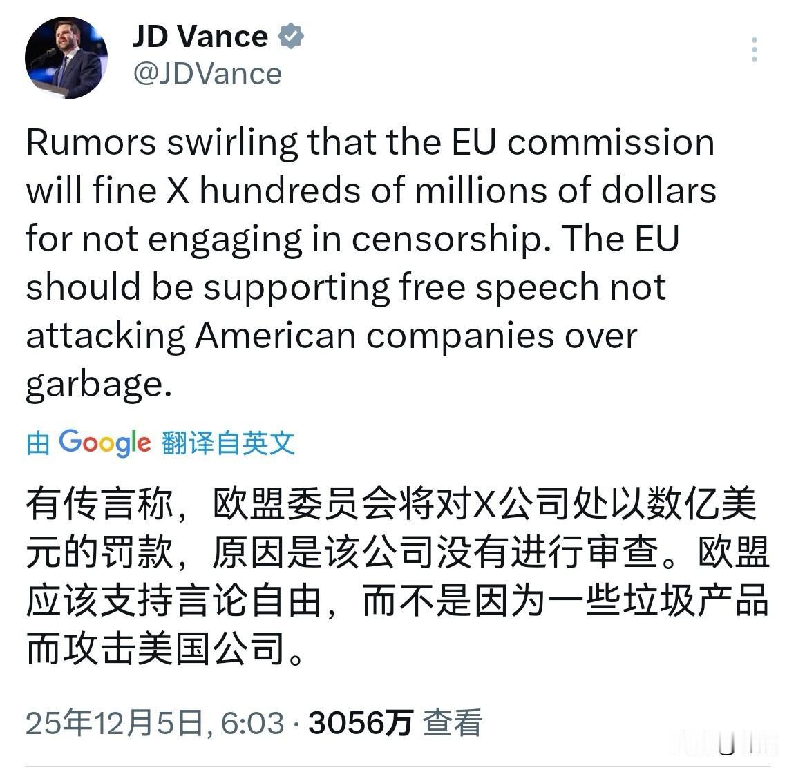 欧盟出息了,对美国公司罚款1.4亿美元。 据报道,欧盟对马斯克的X(原推特)罚款1.4亿美元,理由是没有遵守欧盟的监管要求。 对此,美国国务卿卢比奥也在X上发文痛批欧盟:“欧盟委员会处以的1.4亿美元罚款,不仅仅是对@X 的攻击,更是所有外国政府对美国科技平台及美国人民的攻击。在网上审查美国人的时代已经结束了。” 美国副总统万斯也曾警告欧盟:欧盟应该支持言论自由,而不是就一些毫无根据的事情攻击美国公司。 欧盟这次真的出息了,竟对美国公司出手。等着,懂王一定会给欧盟一些颜色的!