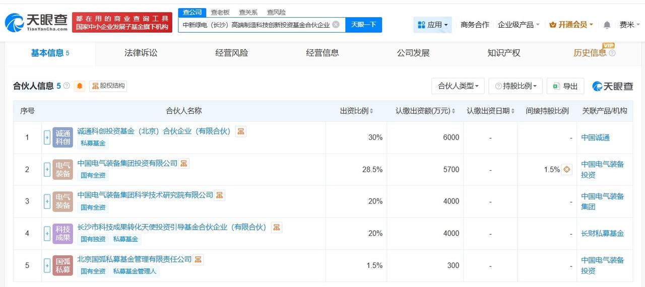 中新绿电高端制造科技创新基金成立出资额2亿 天眼查App显示,近日,中新绿电(长沙)高端制造科技创新投资基金合伙企业(有限合伙)成立,执行事务合伙人为北京国弧私募基金管理有限责任公司,出资额2亿人民币,经营范围为以私募基金从事股权投资、投资管理、资产管理等活动,创业投资。合伙人信息显示,该基金由诚通科创投资基金(北京)合伙企业(有限合伙)、中国电气装备集团投资有限公司、中国电气装备集团科学技术研究院有限公司、长沙市科技成果转化天使投资引导基金合伙企业(有限合伙)、北京国弧私募基金管理有限责任公司共同出资。 天眼查信息: