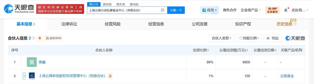 马云持股企业等投资成立私募基金中心出资额1亿 天眼查工商信息显示,近日,上海云锋元创私募基金中心(有限合伙)成立,执行事务合伙人为上海云锋新创股权投资管理中心(有限合伙),出资额1亿人民币,经营范围为以私募基金从事股权投资、投资管理、资产管理等活动。股权全景穿透图显示,该基金中心由黄鑫、上海云锋新创股权投资管理中心(有限合伙)共同出资,其中,上海云锋新创股权投资管理中心(有限合伙)由马云出资约40%。 天眼查信息:
