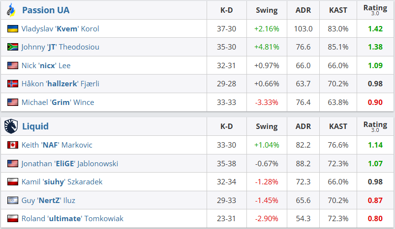 图二Liquid选择Mirage,PUA回敬铁血防守,JT、Kvem和hallzerk三C发力帮助队伍半场取得10-2的巨大领先优势。下半场,Liquid疯狂反扑追分,但无奈挖坑太大难以填补,PassionUA以13-10有惊无险再下一城,大比分2-0横扫淘汰Liquid。