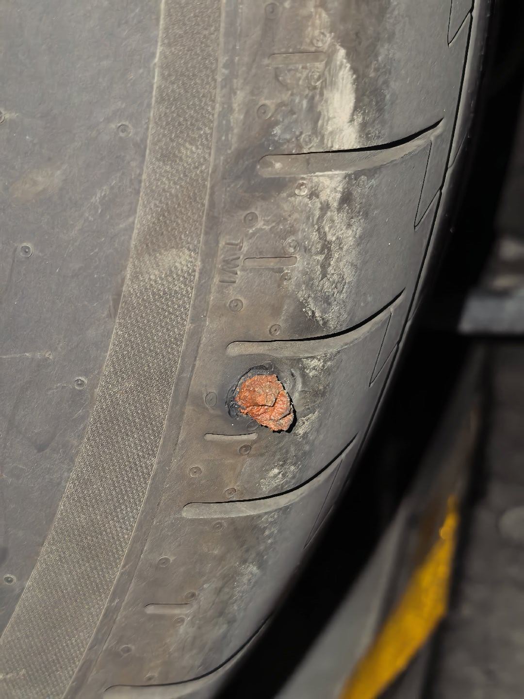 昨天轮胎扎了个螺丝钉。去补胎不给打蘑菇钉,说位置太偏了。简单这样塞了个东西,可以暂时对付一下。但是这也太丑了,像塞了个痔疮栓一样。而且胎压打的有点高,系统又报警了。