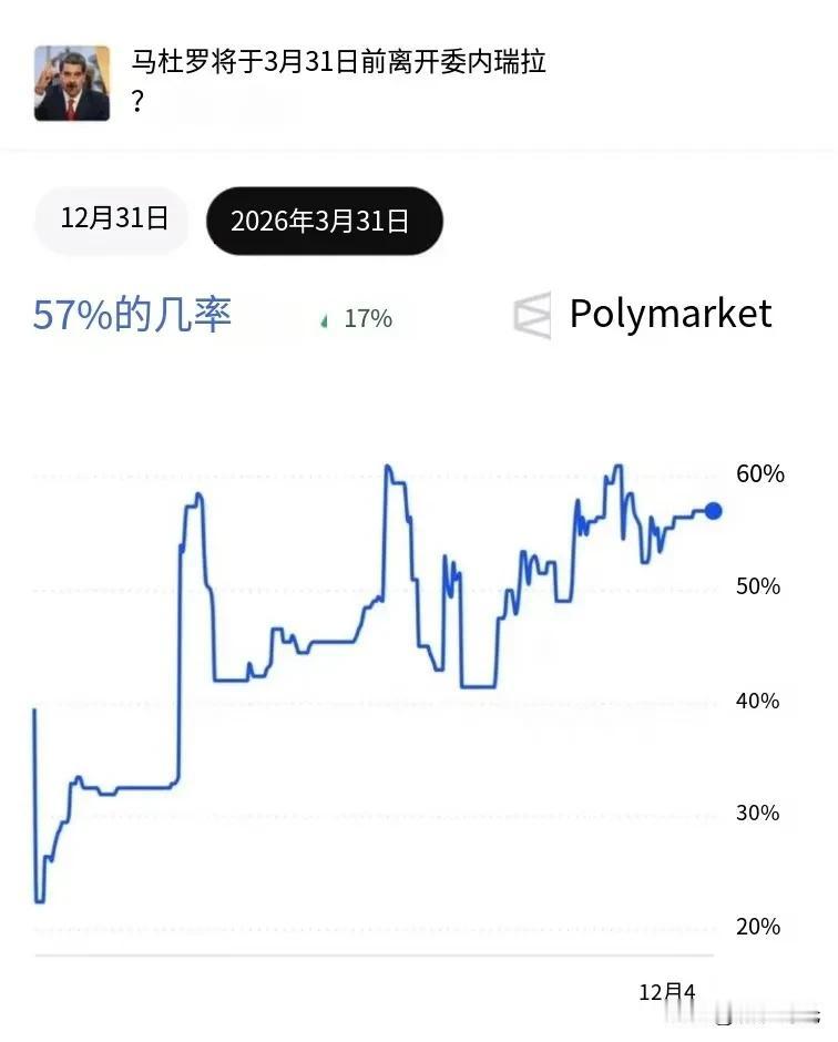 Polymarket预测马杜罗有57%的概率会在2026年3月31日之前离开委内瑞拉。