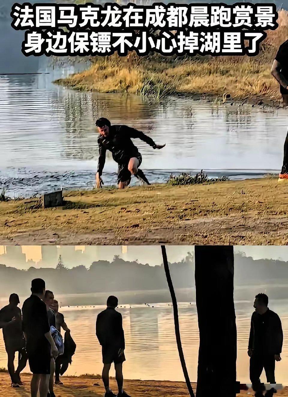 马克龙成都晨跑和路人打招呼马克龙早上在成都晨跑赏湖的时候,原本保镖想保护马克龙不要掉湖里,结果马克龙没掉湖里,保镖自己不小心掉湖里去了!热点现场