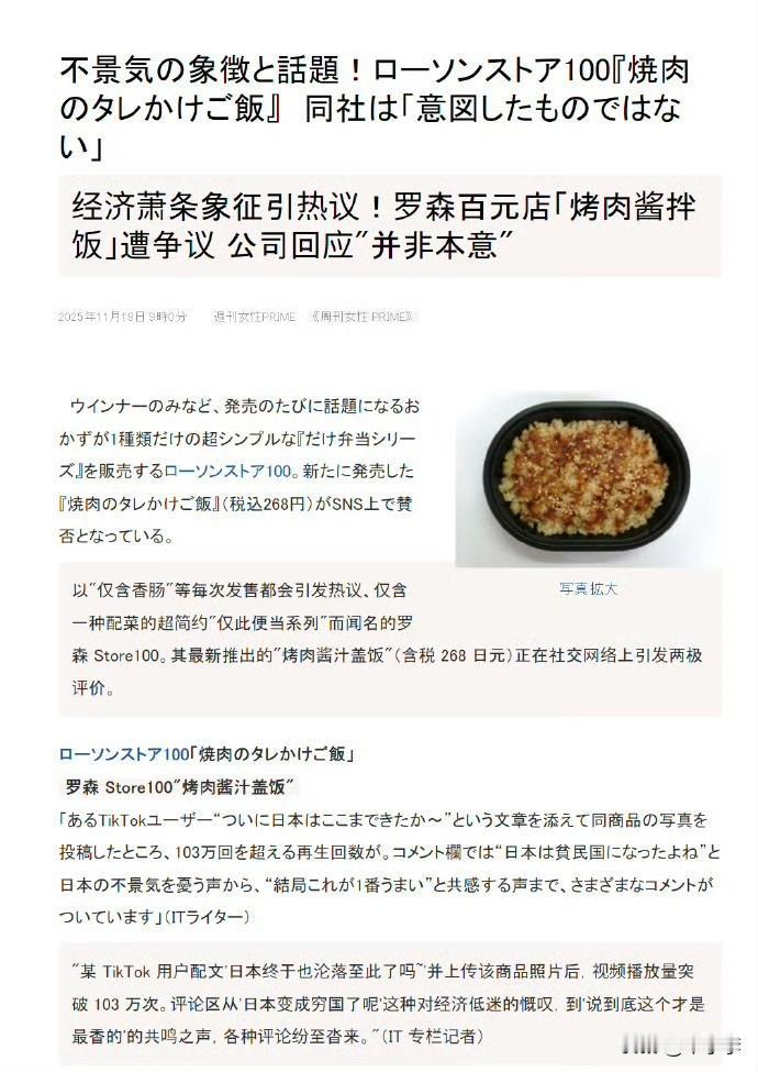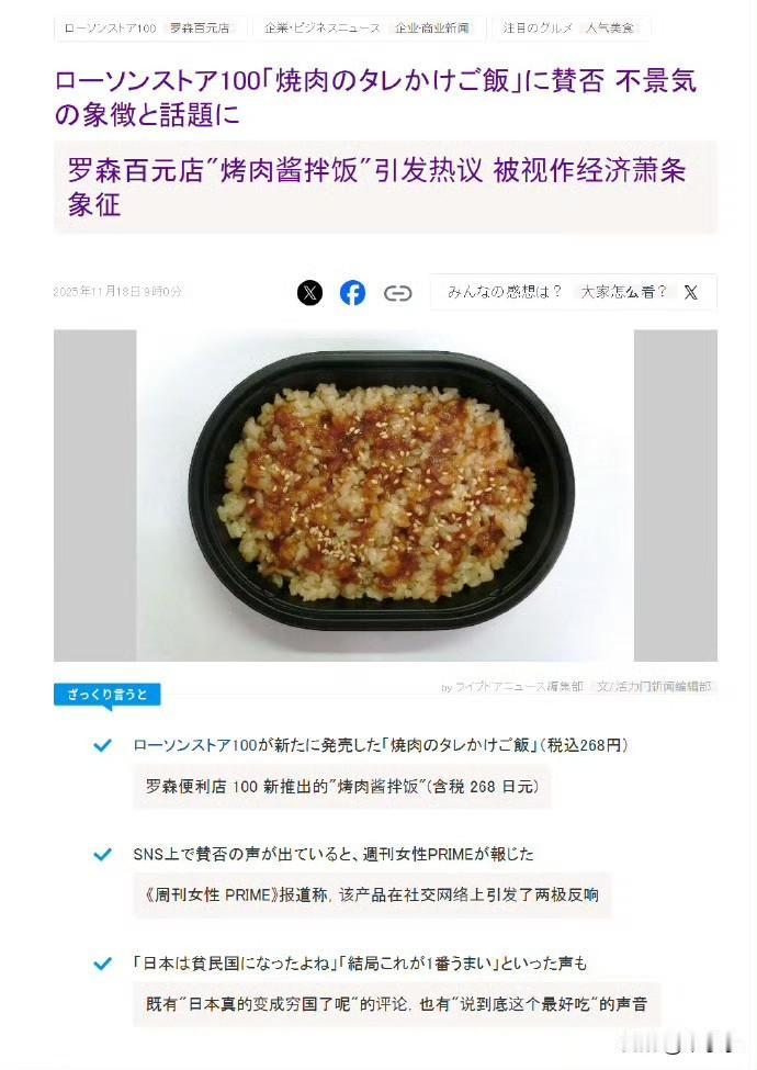 幽默日本,烤肉汁拌饭? 在东大,随便去马路边快餐店,你就要一碗米饭,让老板淋一勺红烧肉汤汁,可能老板看你可怜,还会给你加一勺肉,免费请你吃一顿。 上海全家的鸡腿排大口饭团,有一大片鸡腿,才6块钱。日本这只有饭,啥菜没有,就敢翻倍卖了[看]日本牛肉拌饭 日式盖饭汁