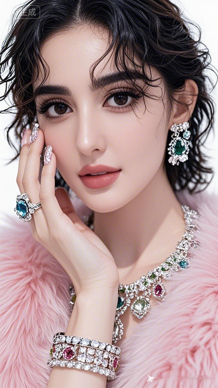 娜扎精致妆容配繁复珍珠宝石首饰。粉色亮闪狐狸毛皮草外套,内搭粉丝绒金线刺绣钉珠短裙,面部特写极致。
