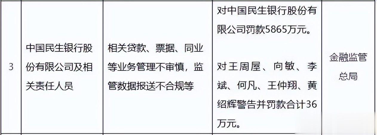10月31日,国家金融监督管理总局发布的行政处罚信息公示列表显示,中国民生银行股份有限公司因贷款、票据及同业业务管理不审慎、监管数据报送不合规等违法违规行为,被处以5865万元罚款。与此同时,王周屋、向敏、李斌、何凡、王仲翔、黄绍辉6名相关责任人分别被予以警告,并合计罚款36万元。据不完全统计,民生银行及其分支机构2025年被罚没金额超8600万元。