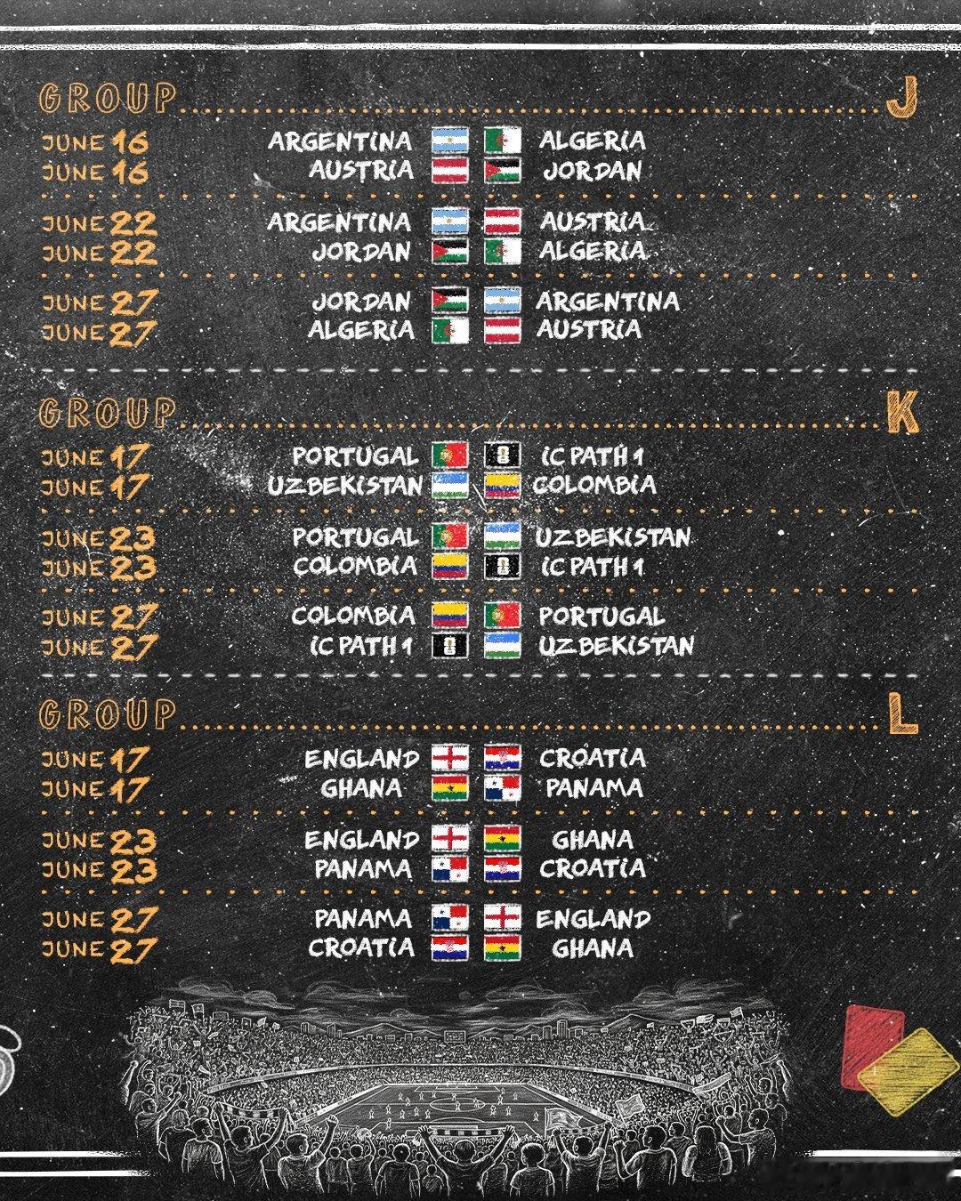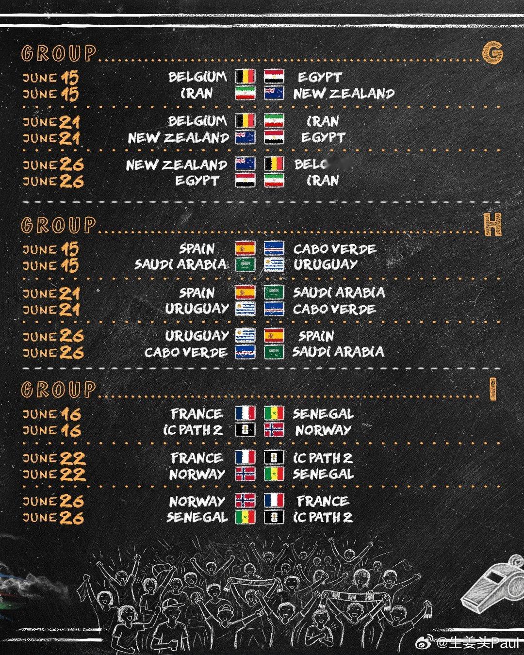 揭幕战:6月11日墨西哥主场再战南非,成世界杯首对重复揭幕战对阵的球队 。 焦点分组:法国与挪威同组,姆巴佩对决哈兰德;英格兰遭遇克罗地亚 。 附加赛悬念:意大利若突围,将跻身加拿大、瑞士、卡塔尔所在的B组。强强前瞻:葡萄牙、阿根廷若均获小组头名,1/4决赛有望碰面。赛制革新:本届世界杯首次扩军至48队,12组前二及8支最佳第三晋级淘汰赛 。