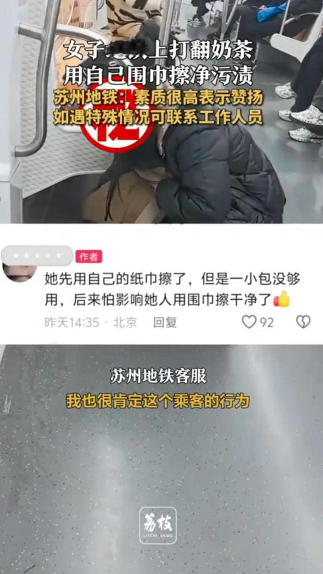 苏州这小姐姐人美,心更美 12月4日,江苏昆山一女子在地铁上不慎打翻奶茶,先用自带纸巾擦拭,因用量不足又用围巾清理干净。 上有天堂下有苏杭,苏杭自古出美女。苏州这位小姐姐用行动诠释了什么叫人美心美,洒了奶茶更多的人本能会躲开,不去管。这位小姐姐对自己的行为认真且极其负责,她怕别人滑了或弄脏了,人家用纸巾擦试,纸巾不够再用用围巾擦干净。她的行为从来未考虑自己的得失,更多地是为大家考虑,真是时代的好青年!值得我们每个去学习,多去帮助别人,为社会的美贡献力量!