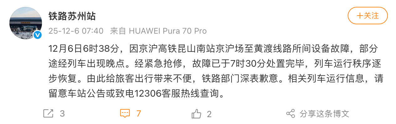 12月6日上午,@铁路苏州站通报:12月6日6时38分,因京沪高铁昆山南站京沪场至黄渡线路所间设备故障,部分途经列车出现晚点。经紧急抢修,故障已于7时30分处置完毕,列车运行秩序逐步恢复。由此给旅客出行带来不便,铁路部门深表歉意。相关列车运行信息,请留意车站公告或致电12306客服热线查询。