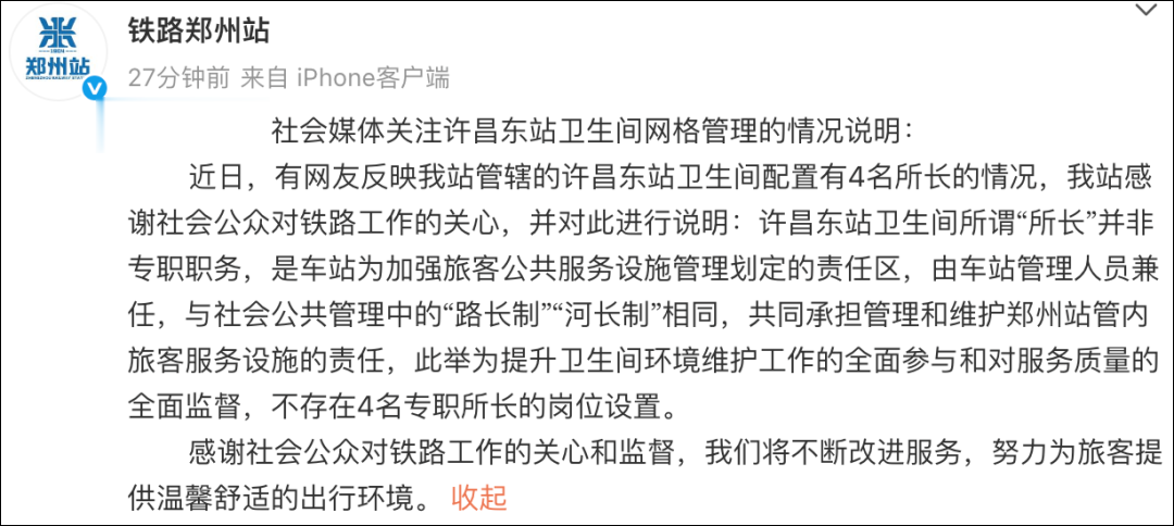近日,有网友反映我站管辖的许昌东站卫生间配置有4名所长的情况,我站感谢社会公众对铁路工作的关心,并对此进行说明:许昌东站卫生间所谓“所长”并非专职职务,是车站为加强旅客公共服务设施管理划定的责任区,由车站管理人员兼任,与社会公共管理中的“路长制”“河长制”相同,共同承担管理和维护郑州站管内旅客服务设施的责任,此举为提升卫生间环境维护工作的全面参与和对服务质量的全面监督,不存在4名专职所长的岗位设置。