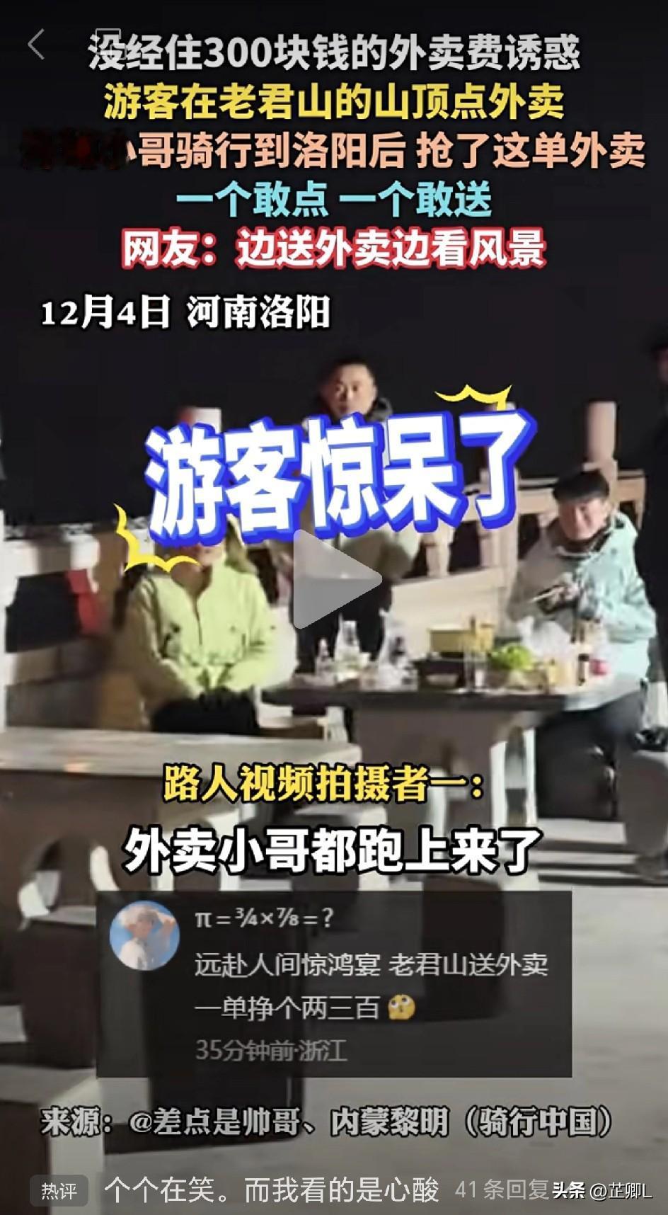 外卖小哥接单爬上老君山,赏金300!游客山顶点外卖,结局意外却暖心! 12月4日,河南洛阳发生了一件让全网热议的“神操作”:一位爬上了老君山山顶的游客,心血来潮,要在山顶点个外卖试试,担心没人接单,加了300元外卖费。 重赏之下必有勇夫, 一位骑行环游中国的外卖小哥,正好途经洛阳,刷到了此单。虽然知道这单送到不容易,但还是没有经受住300元外卖费的诱惑,直接抢单成功。 小哥从商家拿了商品,然后直奔老君山。 交了100元门票钱,爬山一公里时,小哥还能笑着自拍视频。爬到四公里处的时候,已经累的上气不接下气,说不出话了。 40分钟后,他成功登顶,却没找到点单的客人,反而把山顶的游客全惊呆了:“这也太狠了吧,老君山山顶,外卖小哥都跑上来了!“ 最终,因为没找到点单的顾客,小哥只能下山将商品送回商家。 虽然订单没有成功送达,但点餐的游客很仗义,照样把单给结了! 这事传到网上,评论区直接炸了: “人家爬山都是花钱,你是挣钱!” “没有扯皮,真好!” “小哥体力真棒,才用了40分钟。” “能玩还能实赚200,多少外卖小哥羡慕了!” “这多好,欣赏风景还有钱赚,最爽了!不比去花钱的人更有性价比!” 也有人看了视频觉得心酸,感叹小哥不容易。但更多网友反驳: “没必要可怜别人,可怜或者心酸都是负面情绪。这是一群积极生活的人,挥洒汗水用劳动赚取报酬,没有抱怨,还能看到生活的美好。为他点赞!” 是啊,生活有时就像爬山,累归累,但总有人一边喘气一边向前,还能在路上遇见风景、赚到经历。 这样的故事,你看暖了吗? 信息来源于洛阳网,侵联删!
