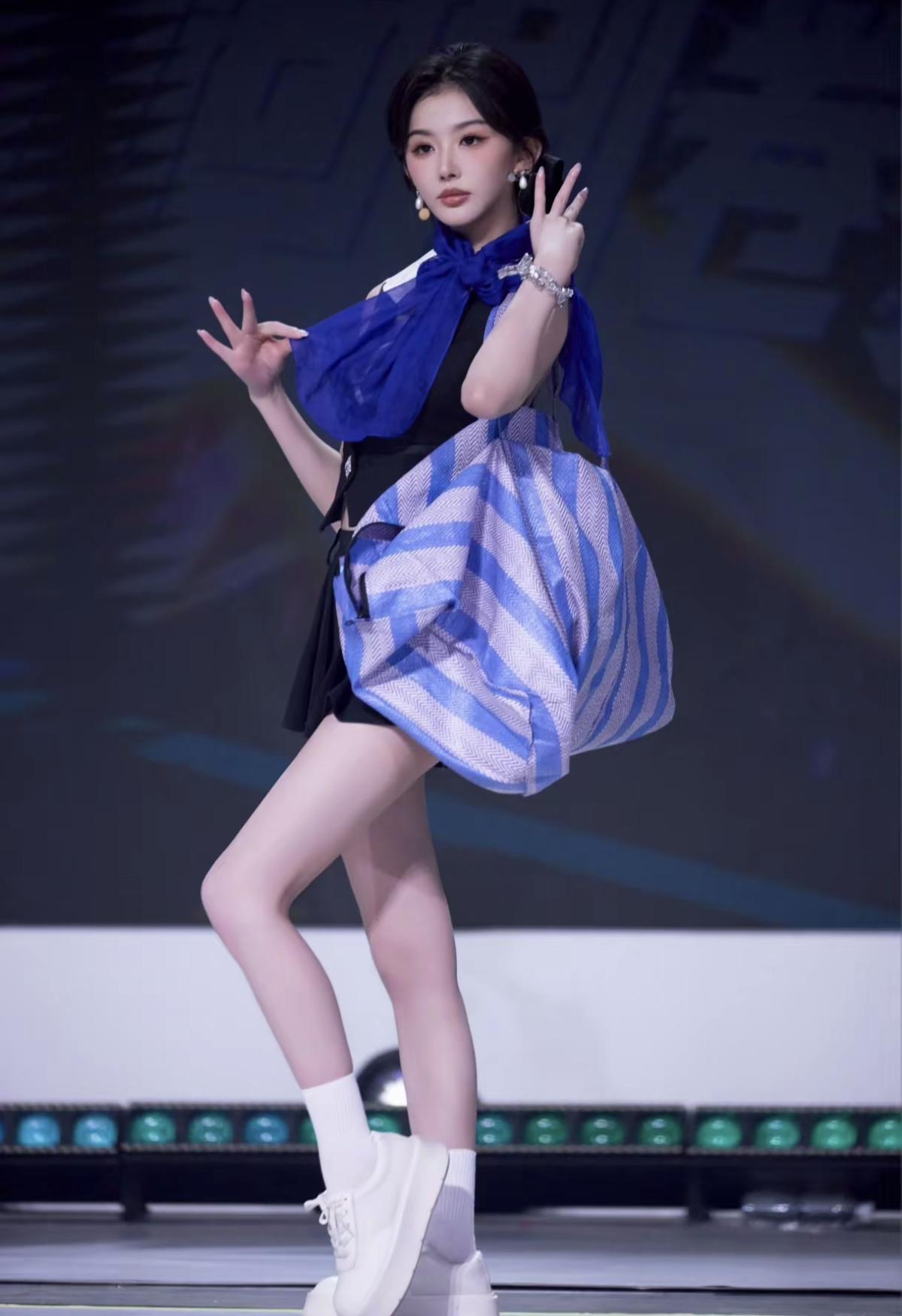 舞台上高马尾甩出发浪,公主裙配大蝴蝶结,头包脸比例自带精致buff,她的每一个
