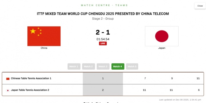 直播吧12月06日讯2025成都混团世界杯第二阶段,中国vs日本。第五盘关键战,男双林诗栋/王楚钦7-11、9-11、11-6篠塚大登/户上隼辅,大比分国乒暂7-5日本。