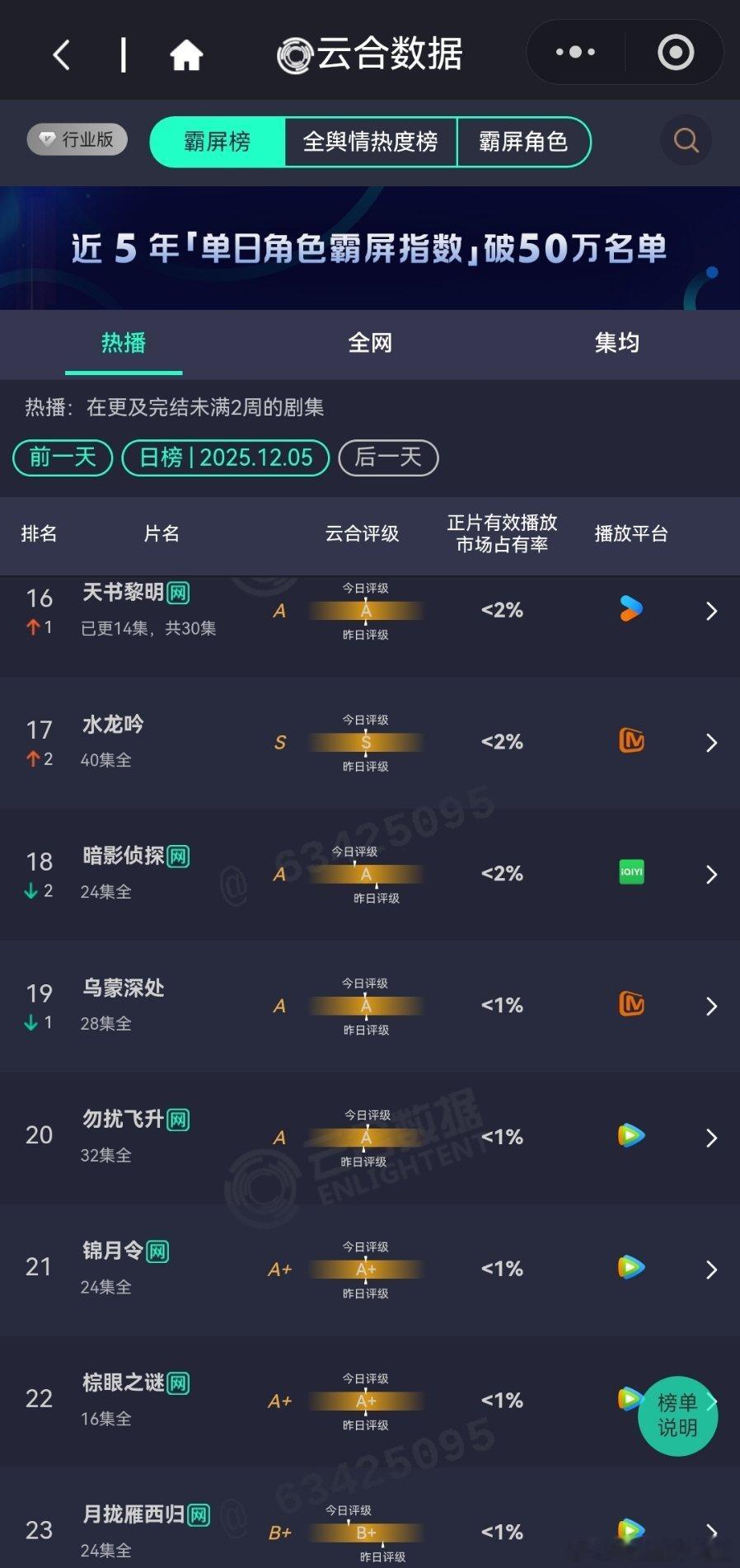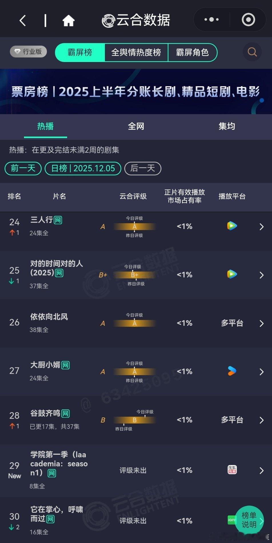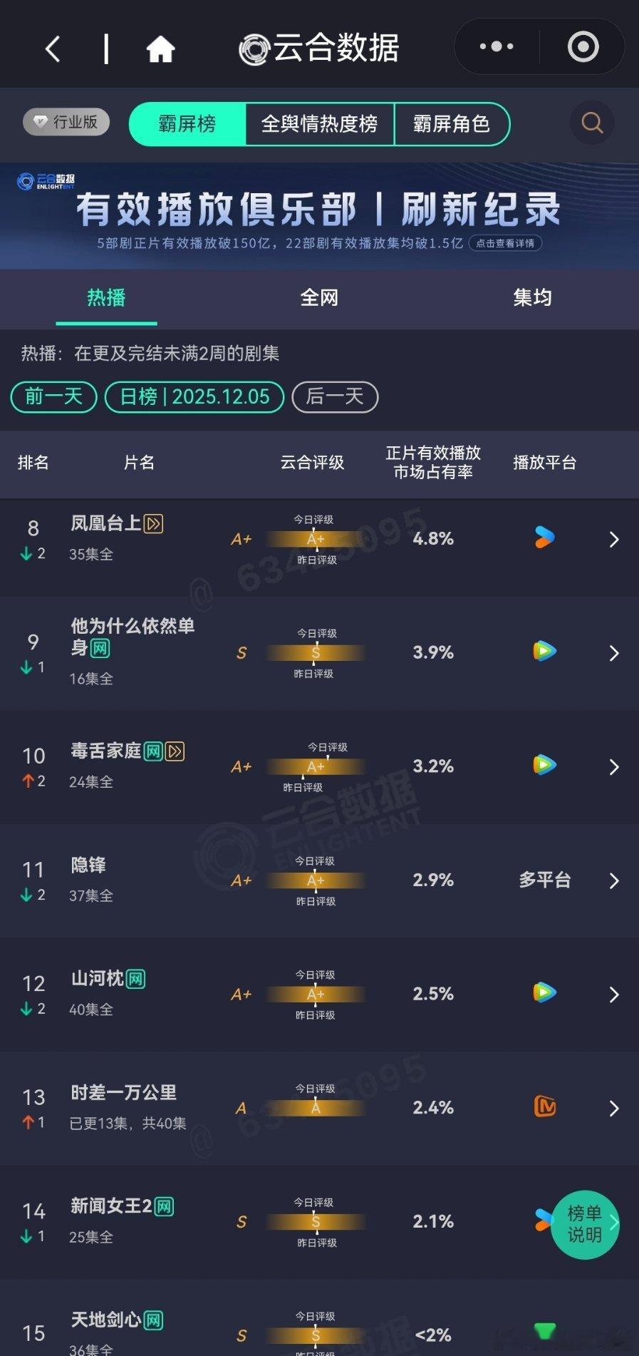 12月5日云合播放占比云合 大生意人17.7%大生意人 评级下降了,大盘应该是降