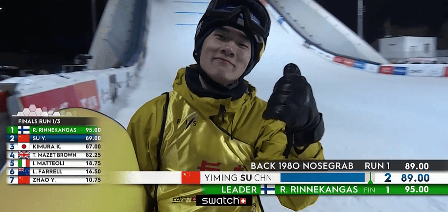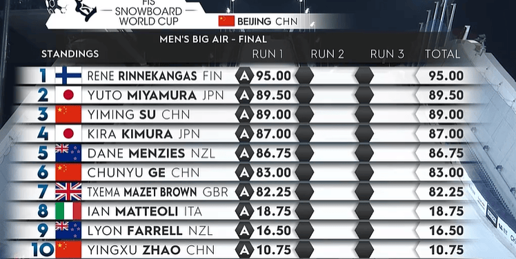 目前,第一名是芬兰选手雷内-林内坎加斯,95.00分;第二名是预赛第一的日本选手木村葵来,89.50分。