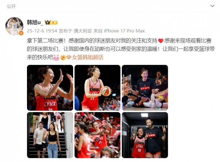 昨天晚上,韩旭迎来WNBL主场首秀,出战25分钟,13投6中得到19分3篮板2抢断,帮助珀斯山猫98比81战胜墨尔本南部飞人。比赛结束后,韩旭再次登上珀斯山猫官推赢球海报封面。
