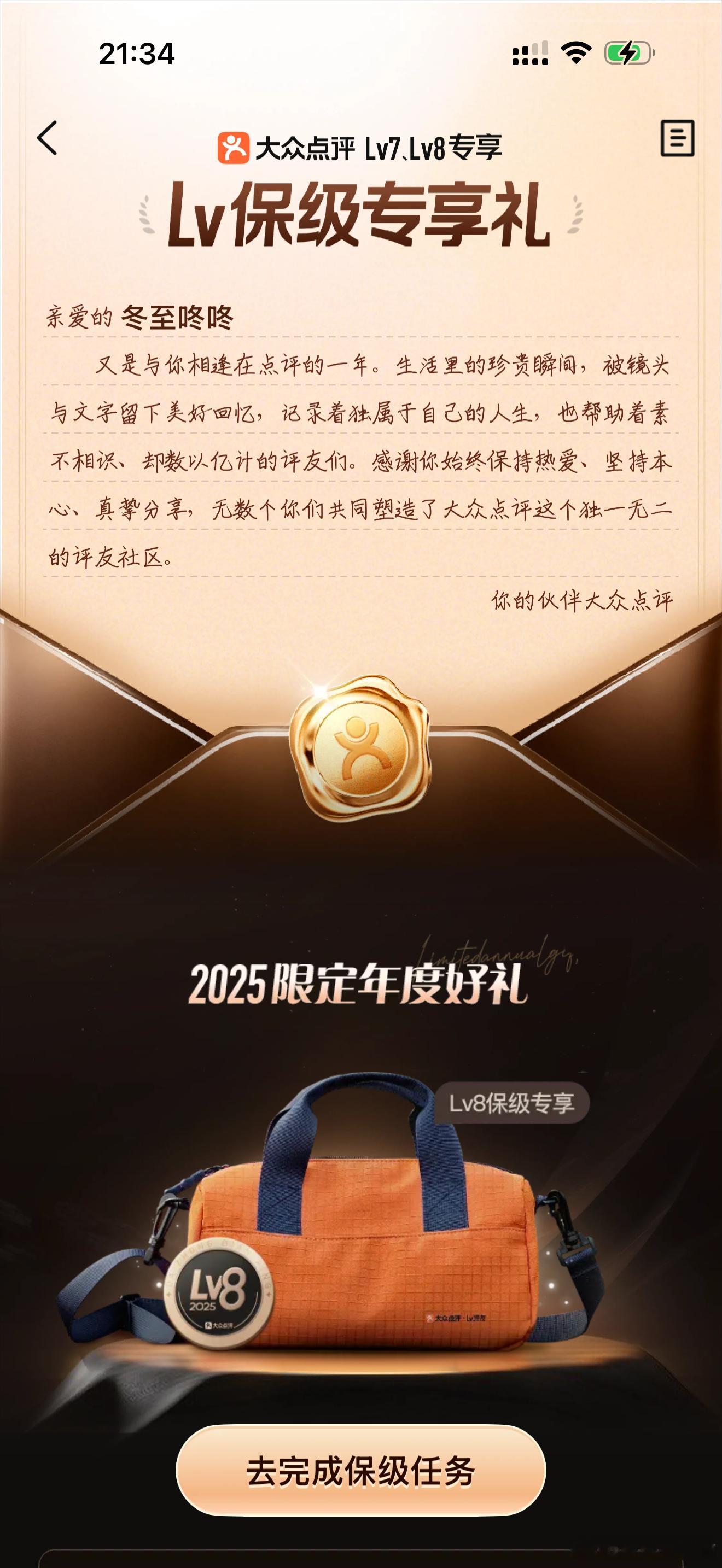 去年的大众点评lv8礼物是一条毛毯,抽给了幸运粉丝。今年保级成功,礼物是挎包,依旧抽给幸运粉丝吧~老规矩铁粉➕评论,背上咚子这个满级包去餐厅吃饭说不定会有优待呢 大众点评发现生活中的小美好 抽奖详情