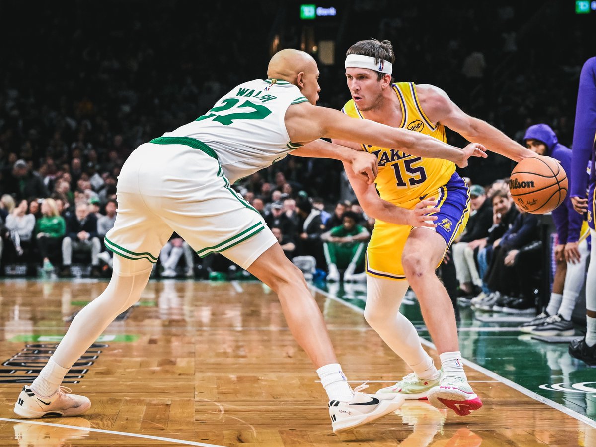 今日湖人球员奥斯汀-里夫斯在凯尔特人球员乔丹-沃尔什的防守下3投0中,只得到了3分。
