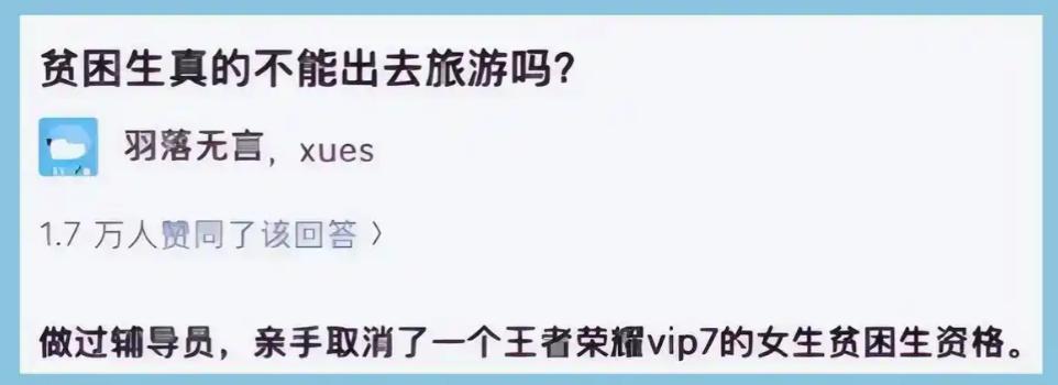 “穷人就不配打游戏吗?”一名大学辅导员在网上发帖称,自己曾经取消了一名女生的贫困生资格,原因是他发现这名女生在一款游戏里充值了至少2000元。 “穷人就不能玩游戏了吗?” 这句话是一个女大学生在知道自己被取消贫困生资格后,说出口的第一句。 她当时情绪彻底绷不住,眼泪哗哗地掉,整个人都有点语无伦次。 场面挺让人唏嘘,可仔细一听,又有点说不通。 事情是这样的:辅导员在审核她的情况时,发现她在《王者荣耀》里充了不少钱,而且不是几十块几百块那种,是那种“大手子”级别的消费。 这个事儿一被曝光,网上马上就吵起来了。 有人替女生说话: 现在社会贫富差距这么大,有钱人天天滑雪、骑马、出国旅游,穷孩子平时哪也去不了,在宿舍玩个手游怎么了?就算拿助学金买点皮肤,也是她自己的钱,别人管不着。还有网友提到所谓的“财产自由”,觉得钱到了她手里,她爱咋花就咋花。 这些话乍一听挺有道理,但问题的关键不在于“玩不玩”,而在于“怎么个玩法”。 根据学校调查,这女生的游戏账号达到了“贵族7”的等级。玩过王者的人都懂,那不是靠每天打两把就能升上去的。那是一步步用钱堆出来的,贵7起步就是两千块,有的人冲到这个等级可能要五千。 你想想,两千块对于一个真正困难的大学生意味着啥? 差不多顶得上一大半一等助学金,或者一笔三等助学金的全额。 放到生活中,这笔钱能让一个普通女生在食堂踏踏实实吃两三个月的饭。 就是这样一笔能解决温饱的问题,她一跺脚就充进了游戏里,为的是那些虚拟的皮肤、特效和荣耀标志。 更关键的是,室友们平时看她的生活,完全不像是个家里特别困难的孩子——零食不断,外卖也不差钱,经常和朋友打游戏到半夜,生活看着比普通家庭的孩子还更松快些。 辅导员正是基于这些信息才决定取消她的资格,而不是单纯因为“她玩游戏”。 助学金本来就是救急的,是给那些没钱吃饭、课本都得抠着买的学生撑一把的。结果这钱刚发下去没几天,就被她当成娱乐预算花了。 就像你捧着一瓶热水递给冻得发抖的人,对方没喝两口,还拿去洗手、洗脸,你说气不气? 网上有人想起前段时间那个高二男生的新闻——为了攒1200块给妈妈治病,整整捡了三个月的瓶子。 你再看看这边,两千块轻轻松松往手游里一点就没了,两种生活摆在一起,差得不是一星半点。 所以很多人的不满根本不是针对“贫困生不能娱乐”。 谁规定贫困生不能打球、不能看书、不能玩免费游戏? 真正让人难以接受的是:本来为了帮学生渡难关的钱,被拿去满足虚荣心了。 钱进了个人的卡里确实自由,但贫困生资格不是想要就要的,它背后代表的是社会把资源优先给更难的人。既然拿着国家的救助,就得对得起这份信任。 就像前些年唐尚珺想申请助学金受阻、或者有人买了最新苹果手机被举报一样,大众为什么反应那么强烈?因为大家都清楚,这类资源有限,应该让给那些连下一顿吃什么都发愁的孩子,而不是让它成为消费升级的资金池。 至于这位女生在办公室里哭诉觉得委屈,也许她自己真没意识到这件事的严重性。但你换个角度想想:如果任由这种事发生,真正需要帮助的学生该情何以堪? 辅导员这次的处理很明白,也很到位: 你爱玩游戏没人拦你,你想充值,你自己打工挣的钱爱怎么花就怎么花; 但把助学金当成娱乐预算,那就不行了。 如果你能轻轻松松拿出几千块冲游戏,那说明你远没有到“必须依赖这笔钱才能撑过去”的地步。 既然如此,就把这份救命的帮助,留给比你更难、也更值得的人吧。