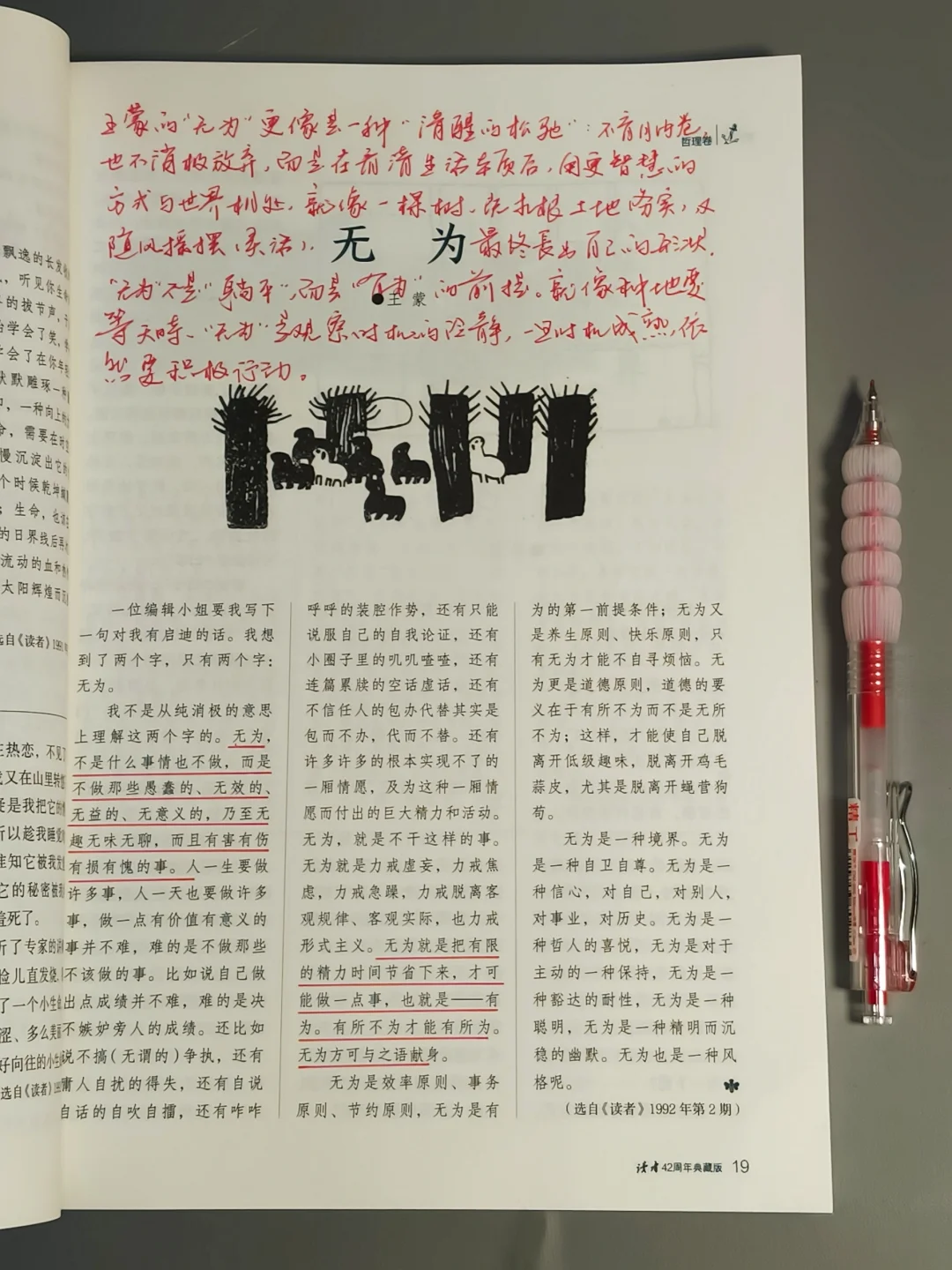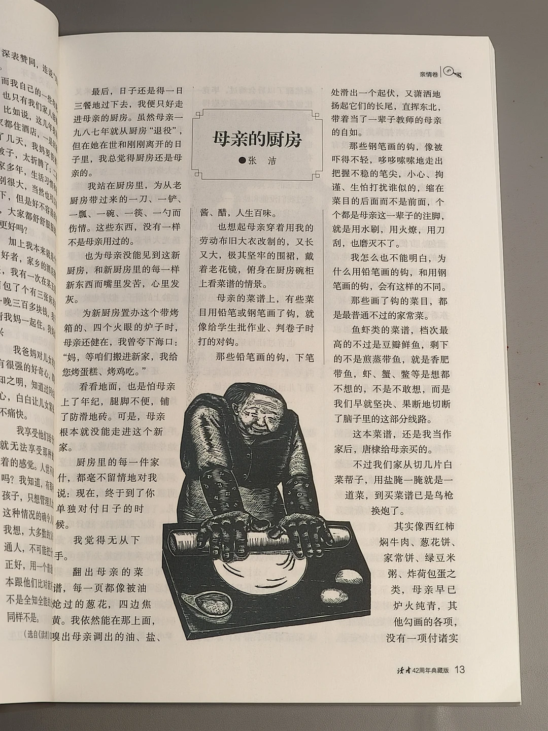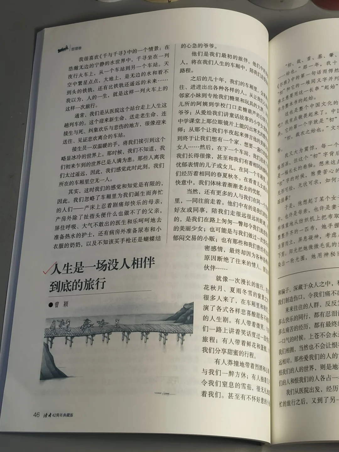 想想那个年月,课外书也很少见,而它几乎承包了我所有的精神世界。那些蜷缩在课桌下偷读的时光,那些被文章里的故事震撼、感动的瞬间,是带我窥见大千世界的窗口,帮我在作文本上落下第'一个精彩比喻,也让少年的我的心里种下了对文字蕞初的热爱。