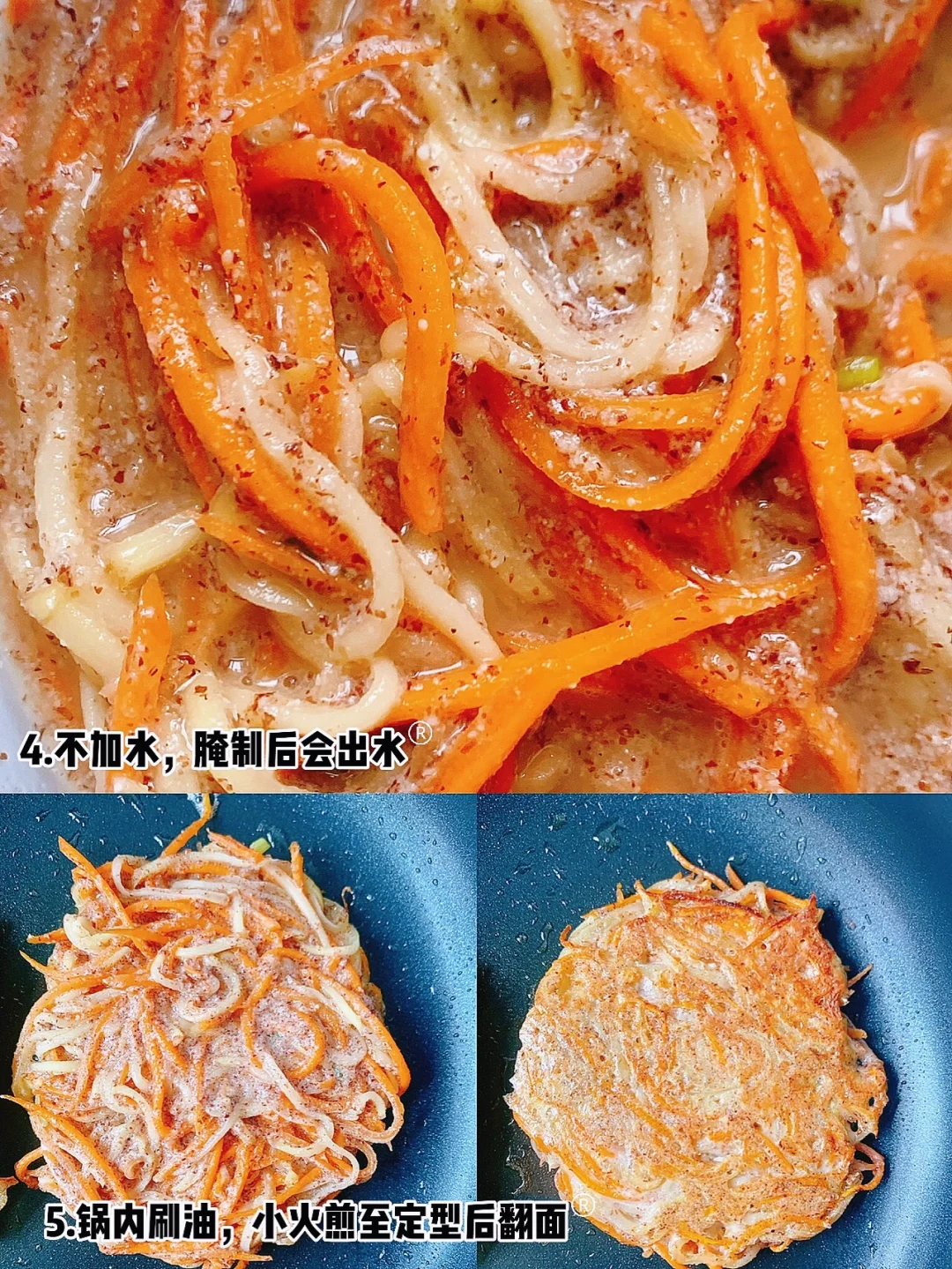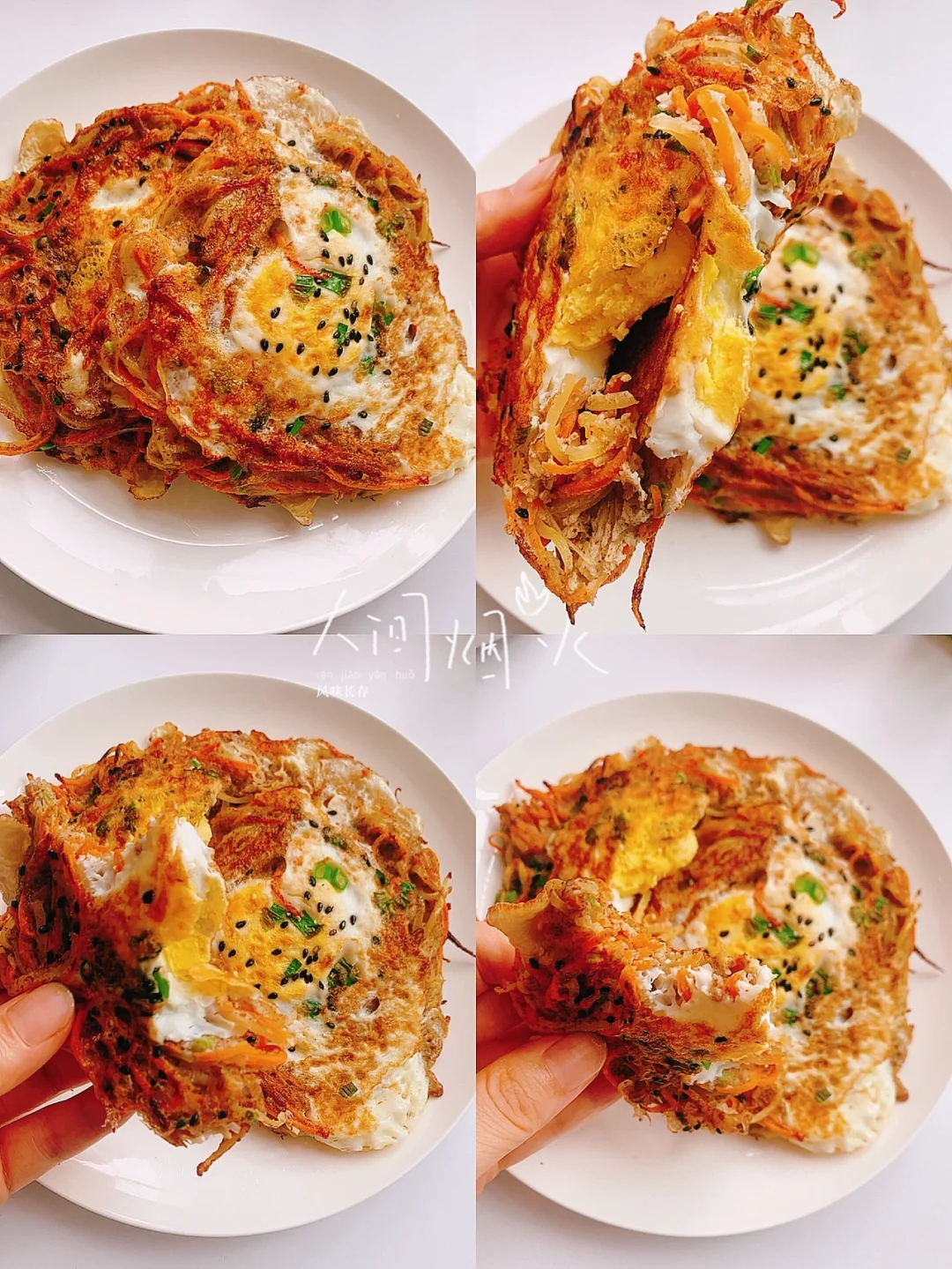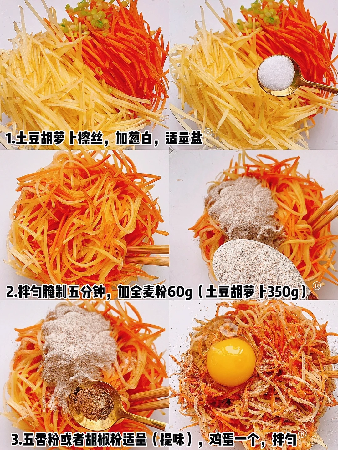早餐不知道吃什么的看👀过来❗❗ ✨✨饱腹感强,吃一口就爱上的味道,十分钟就可以搞定的快手早餐饼,超级适合手残党。搭配番茄🍅酱真的是绝绝子[派对R][派对R][派对R] 【全麦土豆丝饼】送给你[向右R][向右R][向右R][向右R][向右R][向右R][向右R][向右R] 🥗食材: 土豆🥔,胡萝卜🥕,鸡蛋🥚,全麦粉 📝做法: 1️⃣土豆胡萝卜擦成细丝,加葱白,适量盐腌制五分钟。 2️⃣加入全麦粉翻拌均匀,加五香粉或者胡椒粉提味,打一个鸡蛋,拌匀即🉑煎饼了。 3️⃣锅内刷油,小火煎成小饼。 4️⃣还可以整理成鸟窝状,窝一个鸡蛋进去,撒上葱花黑芝麻。 ❤❤小提示: 1️⃣不用加水,腌制后会出水。 2️⃣土豆丝不用冲洗淀粉,这样煎出来的饼糯糯的。 [私信R][私信R][私信R]持续更新减脂餐。 🌈🌈🌈好好吃饭快乐减脂,愿大家多吃不胖呀❗