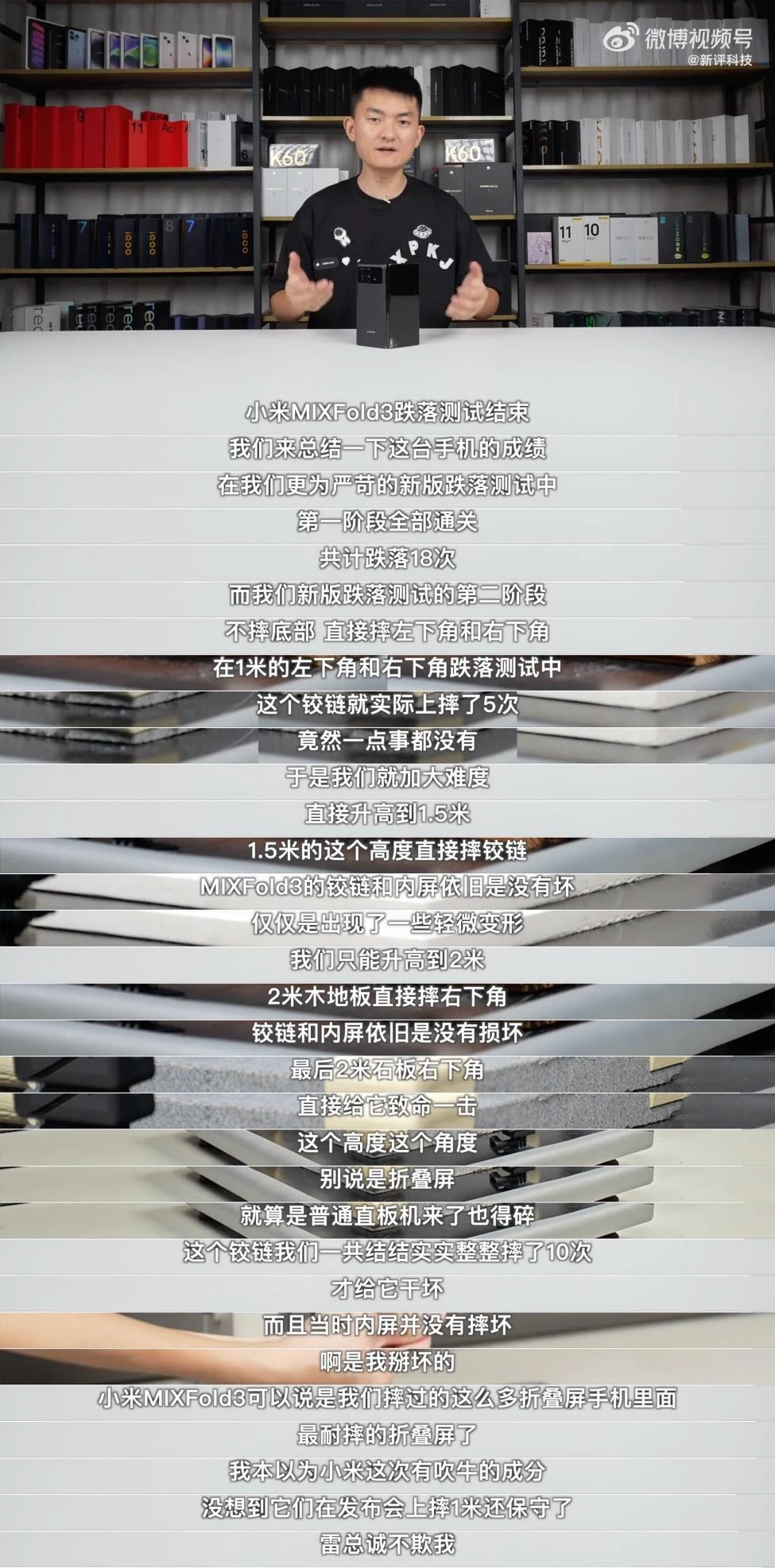 在新评科技的更严苛的新版跌落测试中,小米MIX FOLD3经历了第一阶段18次跌落,又经历了二阶段边角跌落测试,摔左下角和右下角,居然一点事都没有。于是又进入三阶段跌落,升到1.5米跌落还没事,升到2米再摔还没事,就这样一直摔到2米的石板。博主说这是他摔过的首强折叠屏手机。