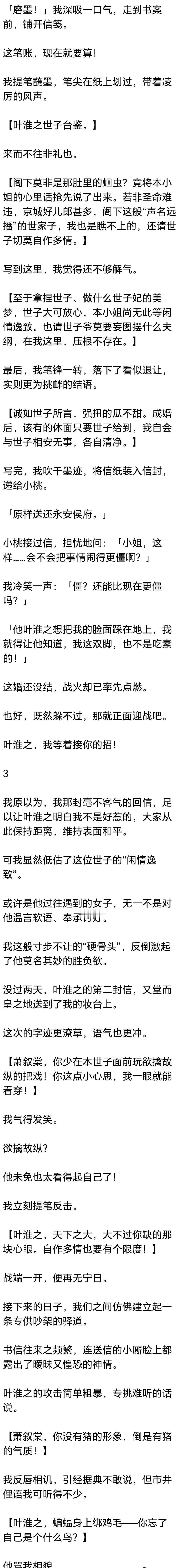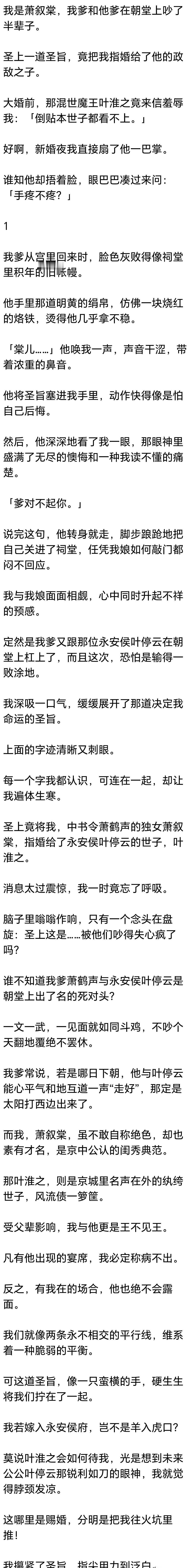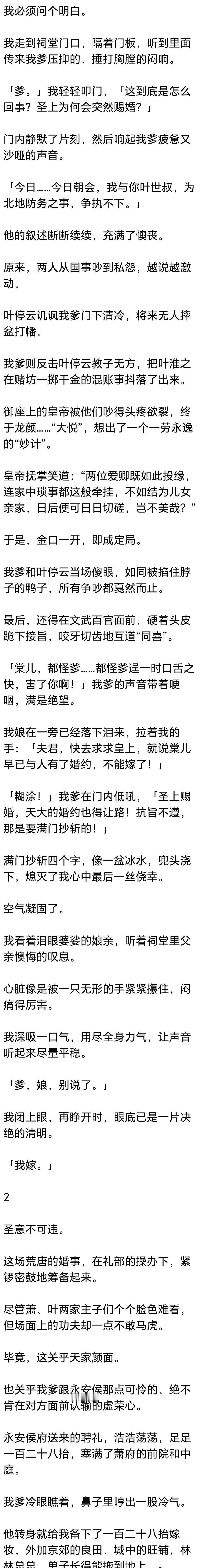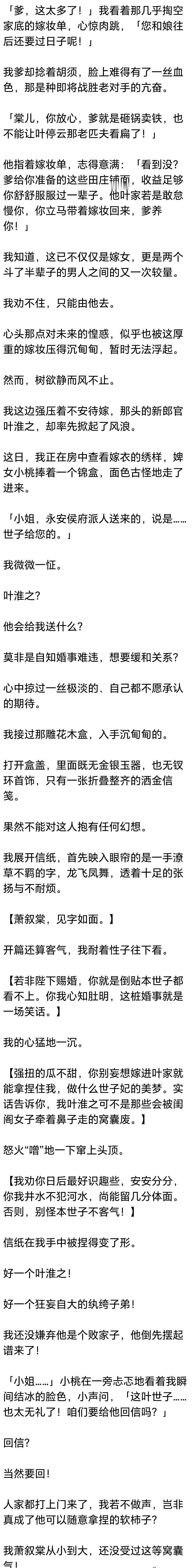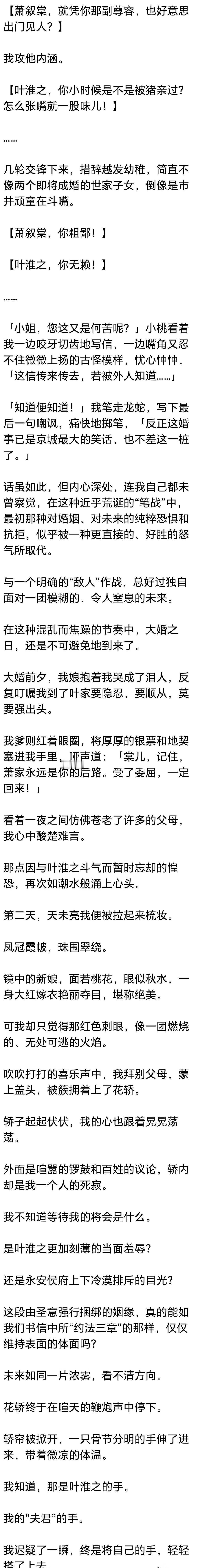 新婚夜,我扇了他一巴掌。 那个传说中的混世魔王,没躲,反而捂着通红的脸凑过来,小心翼翼地问我: “手……疼不疼?” 我当时就懵了。 我爹和他爹,在朝堂上斗了半辈子,恨不得把对方脑浆子都打出来。结果皇上一道圣旨,就把我俩跟捆猪仔似的拴一块儿了。 大婚前,他那封信写得叫一个嚣张:“倒贴本世子都看不上。” 好啊。 我这辈子最不吃的就是威胁。 我憋着一口气,就等着新婚夜,让他知道我萧叙棠不是任人拿捏的软柿子。 可他问我手疼不疼。 那一瞬间,我脑子里准备好的十八套还击方案、一百句骂人台词,全没了。什么朝堂争斗、家族荣辱,也全都虚化成了背景。 就剩下他那双眼睛。 亮晶晶的,有点委屈,又有点傻气,跟只被主人踹了一脚还使劲摇尾巴的金毛似的。 你说这叫什么事儿啊? 我准备了满身的铠甲,以为要上战场拼个你死我活。 结果掀开帐子一看,对方递过来一颗糖。 那一刻我忽然觉得,我爹和他爹在朝堂上吵的那些架,有点可笑。