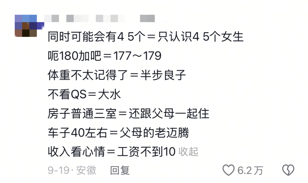 这位男士强调,自己的择偶要求是“三观必须如同小孔成像般一致”,因为上一段恋爱三观不合所以告吹。网友再次在一秒钟之内做出了这段话的阅读理解:价值观不同,意思是结婚拒绝给彩礼,想空手套白狼,结果对方不愿意。