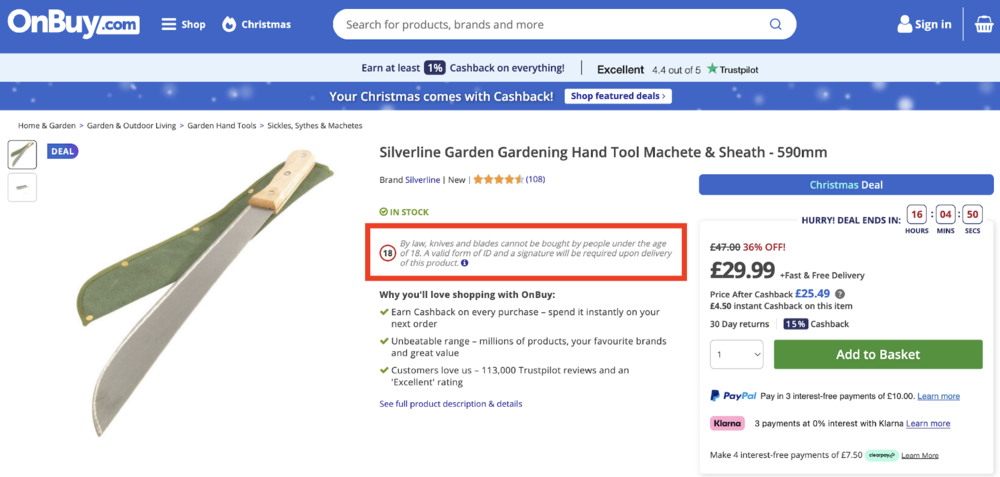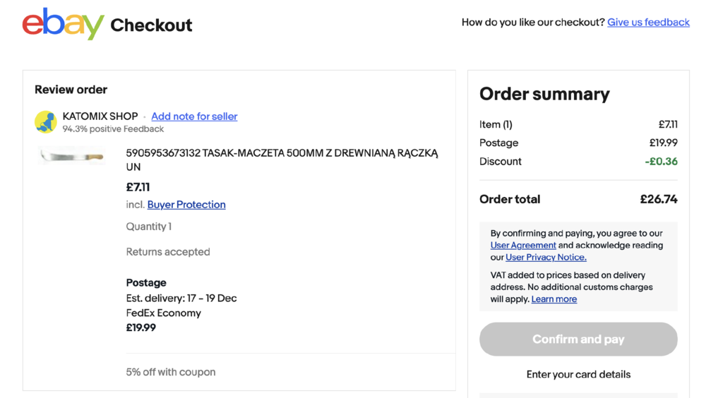 结果显示,虽然大部分网站会显示“未满十八岁的人禁止买刀,因此购物时需要ID照片,并且派件时需要本人签名”。但ebay等二手购物网站管理却显得比较松散,直接用路人身份外加地址和银行卡信息便可以下单了。