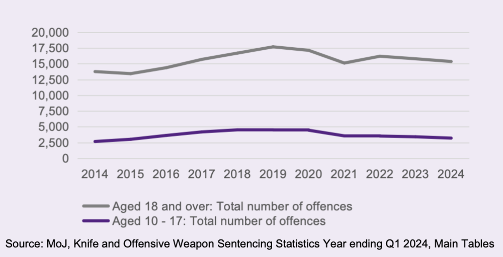 在最近一次司法统计中,所有武器犯罪里,约17%–18%的案件是由10-17岁少年实施。也就是说,大约每5–6起刀具犯罪,就有1起与未成年人有关。