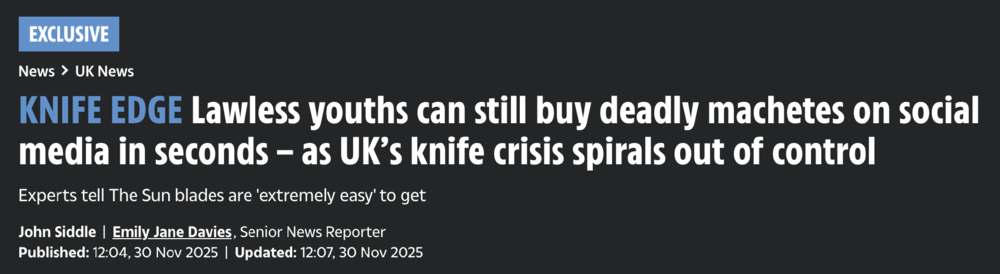 在11月30日,苏格兰太阳报发布了一篇报道,标题直接写着:《英国的刀具危机愈演愈烈,无法无天的年轻人仍然可以在社交媒体上几秒钟内买到致命的砍刀》。